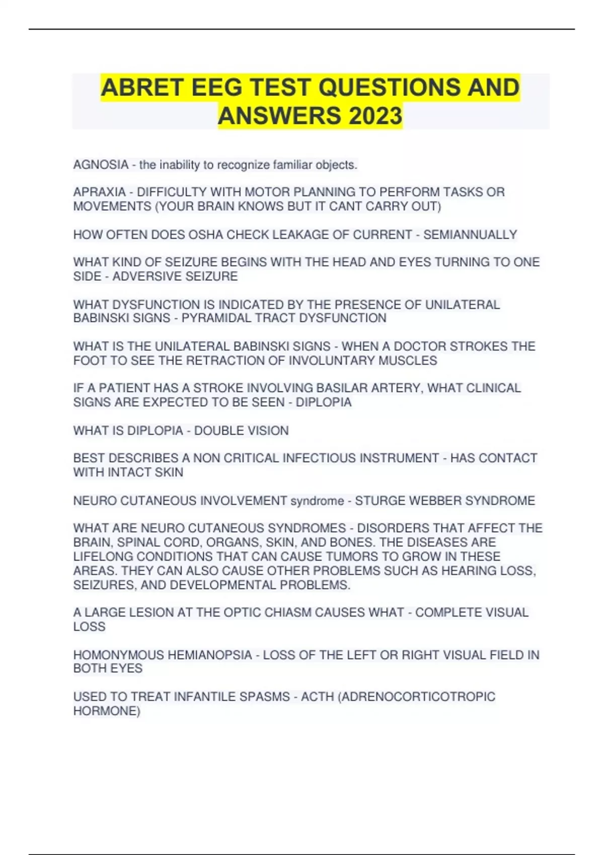 ABRET 2023 Exam | With Complete Questions & Answers (Graded A+) ABRET 2023 Exam | With Complete Questions & Answers (Graded A+) What info do you need to calculate sensitivity? - ANSWER - Deflection (mm) and Voltage (uV) Normal alpha in an adult should NOT be seen in the... - ANSWER - Frontal head region What disease is caused by a proteinaceous particle or prion? - ANSWER - Creutzfeldt-Jakob disease Syringomyelia is... - ANSWER - An abnormal cavity or cyst in the spinal cord Spinocerebellar degeneration - ANSWER - Friedreich's Ataxia Without dietetic treatment, this hereditary disease may cause mental retardation and infantile spasms. - ANSWER - Phenylketonuria Central vertex electrode is... - ANSWER - Cz What EEG pattern is considered a good prognostic sign in a comatose patient? - ANSWER - Electrode inactivity Slow waves of youth attenuate with... - ANSWER - Eye opening ______________________________________ is characterized by multiple seizure types that are difficult to control, especially atonic seizures and atypical seizures, in addition to generalized convulsions, and an abnormal EEG with generalized 2-5Hz slow spike-wave discharges. - ANSWER - Lennox-Gastaut syndrome In a chain linked bipolar montage, what is the most valuable localizing feature? - ANSWER - Phase reversal The dance like movements of head and extremities may be exhibited in a patient with which hereditary degenerative disease? - ANSWER - Huntington's chorea What condition is characterized by nightly rigidity and tremors? - ANSWER - Parkinson's disease Guidelines for recording digital EEG are written by: - ANSWER - The American Clinical Neurophysiology (ACNS) An area of a brain injury that occurs on the opposite side of the head is called: - ANSWER - Contra-coup