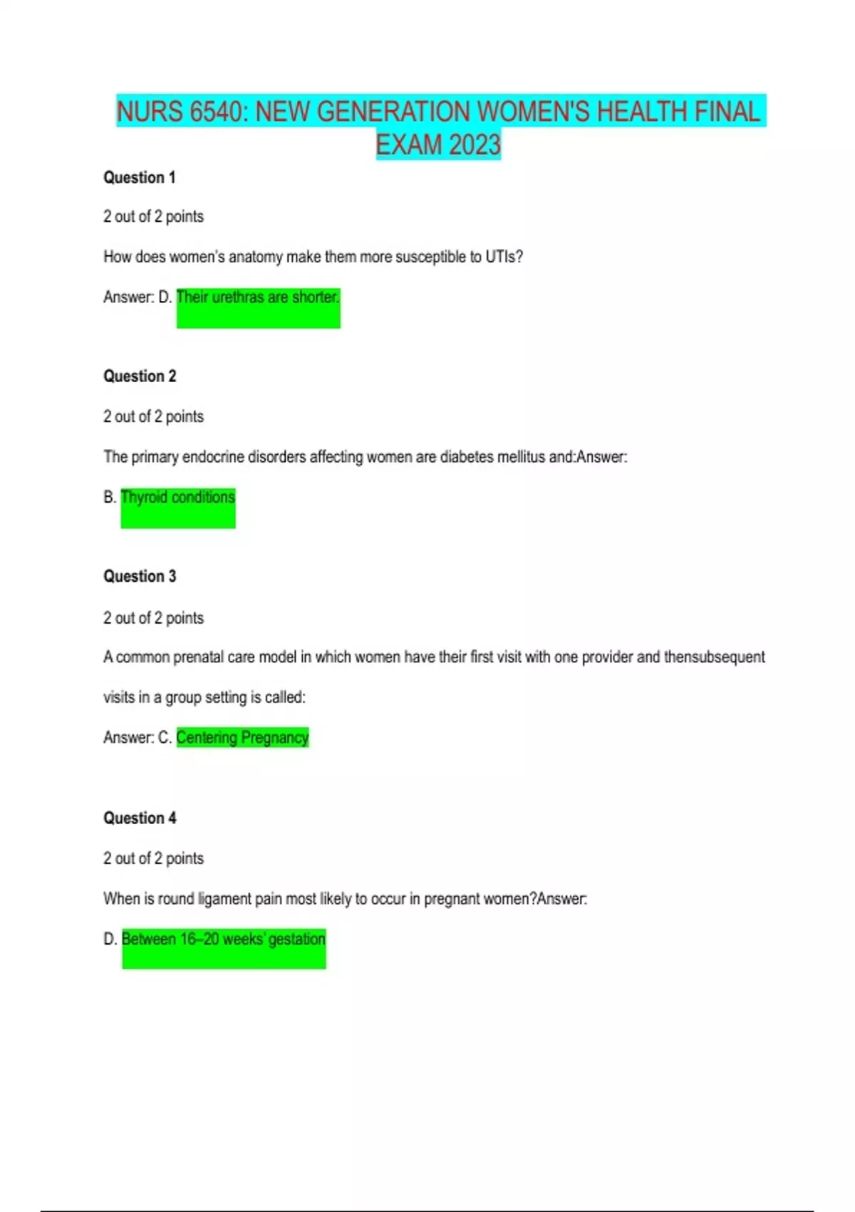 NURS 6540: NEW GENERATION WOMEN'S HEALTH FINAL EXAM 2023 Question 1 2 out of 2 points How does women’s anatomy make them more susceptible to UTIs? Answer: D. Their urethras are shorter. Question 2 2 out of 2 points The primary endocrine disorders affecting women are diabetes mellitus and:Answer: B. Thyroid conditions Question 3 2 out of 2 points A common prenatal care model in which women have their first visit with one provider and thensubsequent visits in a group setting is called: Answer: C. Centering Pregnancy Question 4 2 out of 2 points When is round ligament pain most likely to occur in pregnant women?Answer: D. Between 16–20 weeks’ gestation
