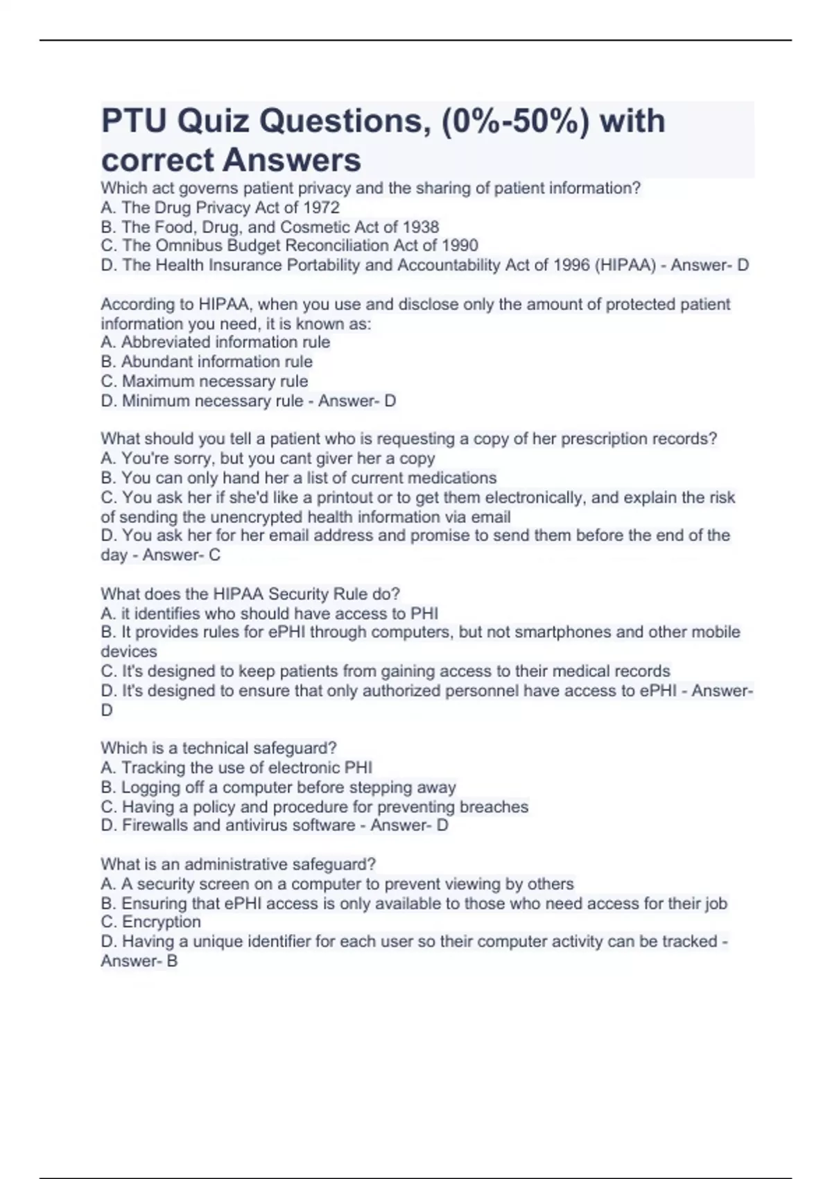 PTU Quiz Questions, (0%-50%) with correct Answers