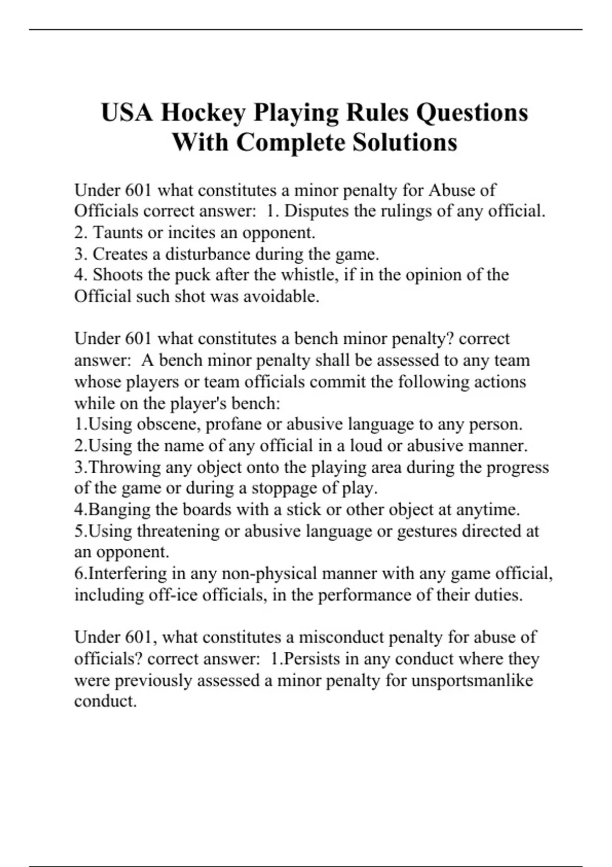 Under 601 what constitutes a minor penalty for Abuse of Officials correct answer: 1. Disputes the rulings of any official. 2. Taunts or incites an opponent. 3. Creates a disturbance during the game. 4. Shoots the puck after the whistle, if in the opinion of the Official such shot was avoidable. Under 601 what constitutes a bench minor penalty? correct answer: A bench minor penalty shall be assessed to any team whose players or team officials commit the following actions while on the player's bench: 1.Using obscene, profane or abusive language to any person. 2.Using the name of any official in a loud or abusive manner. 3.Throwing any object onto the playing area during the progress of the game or during a stoppage of play. 4.Banging the boards with a stick or other object at anytime. 5.Using threatening or abusive language or gestures directed at an opponent. 6.Interfering in any non-physical manner with any game official, including off-ice officials, in the performance of their duties. Under 601, what constitutes a misconduct penalty for abuse of officials? correct answer: 1.Persists in any conduct where they were previously assessed a minor penalty for unsportsmanlike conduct. 2.Using obscene, profane or abusive language to any person anywhere in the rink before, during or after the game. 3.Intentionally knocking or shooting the puck out of the reach of an official who is retrieving it during a stoppage of play. 4.Not proceeding directly and immediately to the penalty bench or to the dressing room, after being penalized and ordered to do so by the officials (equipment shall be delivered to him by a teammate, if necessary). 5.Entering or remaining in the Referee's Crease, unless invited to do so. 6.Interfering in any non-physical manner with any Game Official including the Referee, Linesman, Timekeepers or Goal Judges in the performance of their duties. What constitutes a misconduct or game misconduct, at the discretion of the Referee and based on severity under Abuse of Officials (601A)? correct answer: 1.Touches or holds any official with his hand or stick. 2.Attempts to continue an altercation after been ordered to stop, or resists the linesman in stopping the altercation. 3.Intentionally bangs the boards or protective glass or goal frame with his stick or any other object at anytime. If done in protest of an officials' decision, an additional minor penalty for unsportsmanlike conduct shall also be assessed. A game misconduct penalty shall be assessed to any player or team official under Abuse of Officials for: correct answer: 1.Persists in any course of conduct for which he has previously been assessed a misconduct penalty (player) or bench minor penalty assessed to the team (Team Official). 2.Uses obscene gesture or a racial/ethnic slur anywhere in the rink before, during or after the game. 3.Interferes in any physical manner with any game official, including off-ice officials, in performing their duties. 4.A player who receives their second misconduct penalty during the same game shall be assessed a game misconduct penalty in lieu of the second misconduct penalty. What constitutes a match penalty under abuse of officials? correct answer: 1.Deliberately inflicting physical harm, or attempting to do so, to any game official, including off-ice officials. (Note) Any match penalty assessed under this rule must be reported via written game report by the officials to the USA Hockey District Referee-in-Chief within 48 hours. 2.Deliberately injuring, or attempting to do so, any opposing player or team official. 3.Behaving in any manner that is critically detrimental to the conducting of the game, including spitting at an opponent, spectator, game or team official, or verbally threatening a Game Official, opposing Team Official or opposing player with physical harm. A player sitting on the players' bench uses profanity toward
