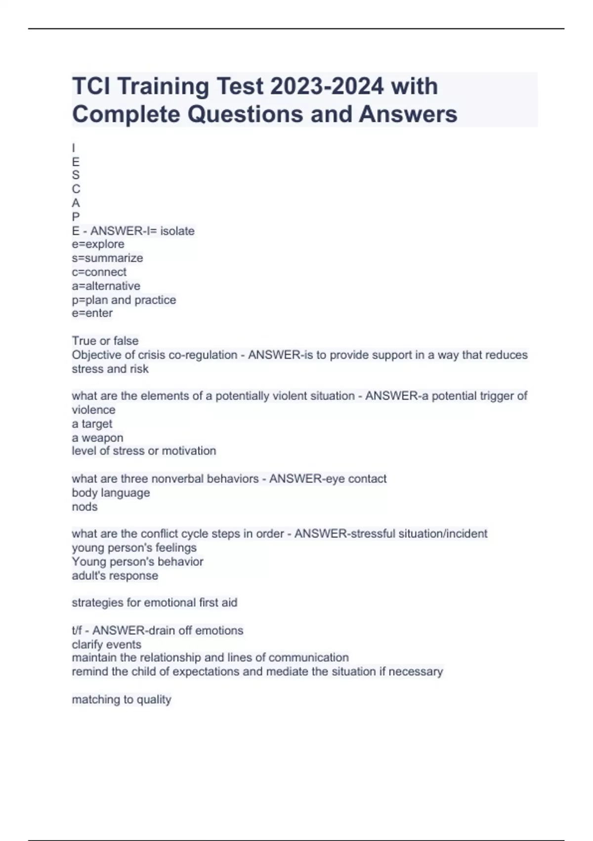 TCI Training Test with Complete Questions and AnswersTCI Training Test with Complete Questions and AnswersTCI Training Test with Complete Questions and Answers I E S C A P E - ANSWER-I= isolate e=explore s=summarize c=connect a=alternative p=plan and practice e=enter True or false Objective of crisis co-regulation - ANSWER-is to provide support in a way that reduces stress and risk what are the elements of a potentially violent situation - ANSWER-a potential trigger of violence a target a weapon level of stress or motivation what are three nonverbal behaviors - ANSWER-eye contact body language