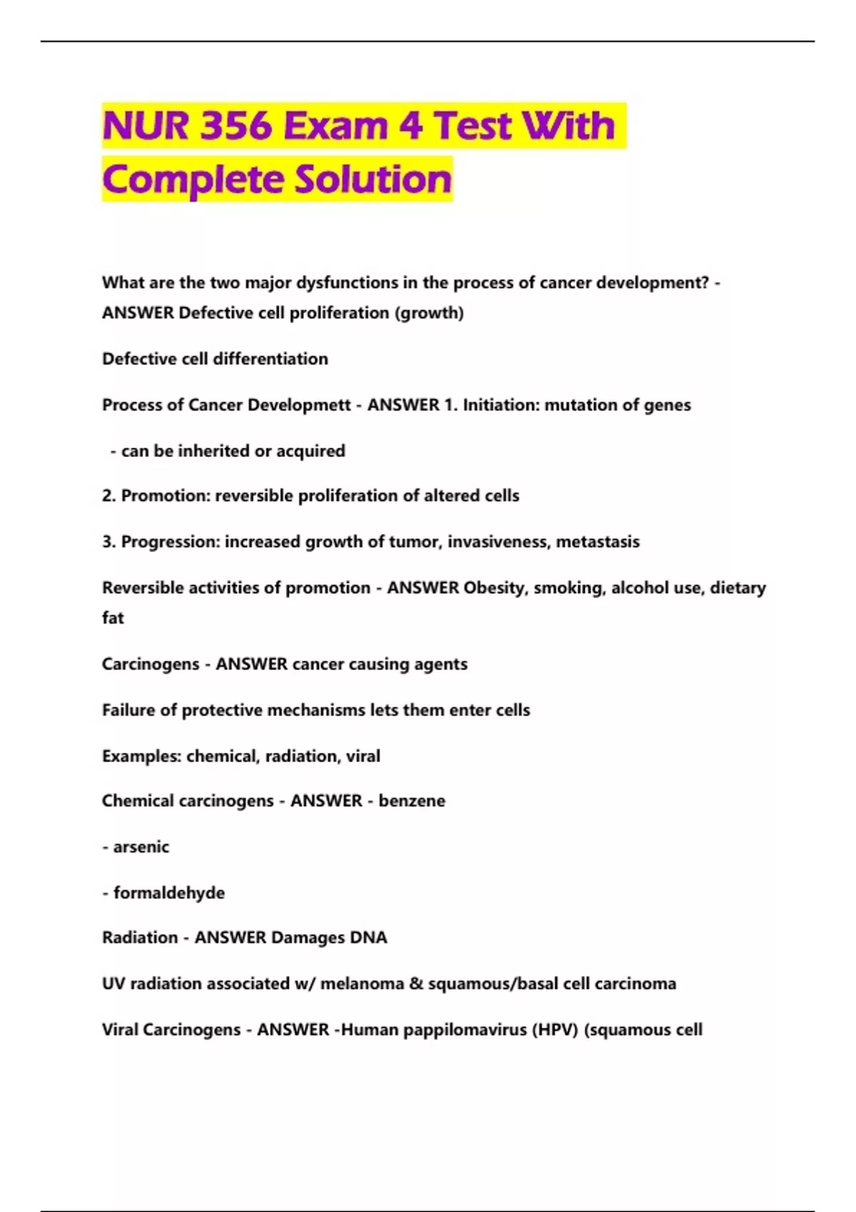 NUR 356 Exam 4 Te st With Complete Soluti on What are the two major dysfunctions in the process of cancer development? - ANSWER Defective cell proliferation (growth) Defective cell differentiation Process of Cancer Developmett - ANSWER 1. Initiation: mutation of genes - can be inherited or acquired 2. Promotion: reversible proliferation of altered cells 3. Progression: increased growth of tumor, invasiveness, metastasis Reversible activities of promotion - ANSWER Obesity, smoking, alcohol use, dietary fat Carcinogens - ANSWER cancer causing agents Failure of protective mechanisms lets them enter cells Examples: chemical, radiation, viral Chemical carcinogens - ANSWER - benzene - arsenic - formaldehy de Radiation - ANSWER Damages DNA UV radiation associated w/ melanoma & squamous/basal cell carcinoma Viral Carcinogens - ANSWER -Human pappilomavirus (HPV) (squamous cell carcinoma) -Hepatitis B Virus (hepatocellular carcinoma) -Epstein-Barr virus (EBV) (lymphoma) -HIV (Kaposi sarcoma) Tumor Classification - ANSWER Anatomical Histology (grading severity) Extent (staging) TNM classification system - ANSWER T: tumor size and invasiveness (1- 4) N: spread to lymph nodes (0- 2) M: metastasis (0- 1) Clinical staging classifications - ANSWER 0: Cancer in situ 1: Tumor limited to tissue of origin; localized tumor growth 2: Limited local spread 3: Extensive local and regional spread 4: Metastasis What is the only definitive means to diagnose cancer? - ANSWER pathological evaluation of a tissue Lifestyle habits to reduce cancer risks - ANSWER - recommended cancer scree nings - self-examination - know the 7 warning signs - seek medical care early - avoid/reduce exposure to carcinogens (cigarettes, sun exposure) - healthy diet and weight - limit alcohol - regular exercise and rest - family risks Goals of cancer treatment - ANSWER cure, control, palliation Cancer Tx: surgery - ANSWER Prevention: eliminate/reduce risk of cancer Cure and control: remove necessary tissue, follow with chemo or radiatio n Supportive/palliative care: gastric feeding tube, fixation of bones at risk for pathologic fracture Cancer Tx: Chemotherapy - ANSWER Antineoplastic: chemical therapy, for most solid tumors and hematologic cancer, effects against dividing cells, proble ms: resting/non cycling cells as tumors get large and cells become inactive - typically given in combination - route: PO, IM, IV (most common) - deliver high concentration of drugs directly to tumor - delivery methods: intraarterial intraperitoneal, intrathecal/intraventricular, intravesical bladder - can't distinguish between normal and cancer cells - mutated cancer cells can become resistant Cancer Tx: radiation - ANSWER Used to treat a carefully defined area of the body - low energy beam = quick, short penetration, used for skin - high energy beam = greater penetration, used for internal targets - divided delivery - used alone or with chemo or surgery Cancer Tx: side effects of chemo & radiation - ANSWER - bone marrow suppres sion - reduction in RBC & WBC (infection risk) - fatigue - GI disturbances - integumentary/mucosal reactions - pulmonary effects (cough, SOB, pulmonary edema) - cardio - cognitive: chemo brain/mental fog - reproductive effects: fertility preservation - skin reactions in radiation treatment field - secondary cancers: leukemia, angiosarcoma, skin cancer Cancer Tx: immunotherapy - ANSWER Uses the immune system to fight cancer Aka biological therapy Boost/manipulate immune system Create environment not conducive for cancer cells Attack cancer cells Cancer Tx: targeted therapy - ANSWER Interferes w/ cancer growth by targeting specific cell receptors and pathways that are important in tumor growth