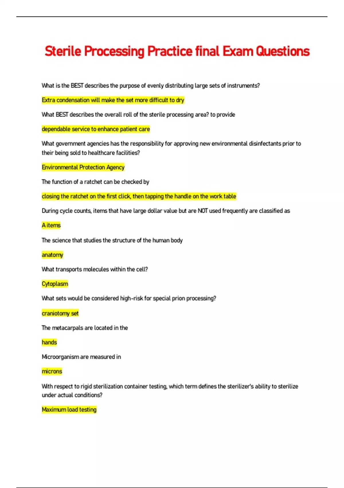 Sterile Processing Practice final Exam Questions What is the BEST describes the purpose of evenly distributing large sets of instruments? Extra condensation will make the set more difficult to dry What BEST describes the overall roll of the sterile processing area? to provide dependable service to enhance patient care What government agencies has the responsibility for approving new environmental disinfectants prior to their being sold to healthcare facilities? Environmental Protection Agency The function of a ratchet can be checked by closing the ratchet on the first click, then tapping the handle on the work table During cycle counts, items that have large dollar value but are NOT used frequently are classified as A items The science that studies the structure of the human body anatomy What transports molecules within the cell? Cytoplasm What sets would be considered high-risk for special prion processing? craniotomy set The metacarpals are located in the hands Microorganism are measured in microns With respect to rigid sterilization container testing, which term defines the sterilizer's ability to sterilize under actual conditions? Maximum load testing