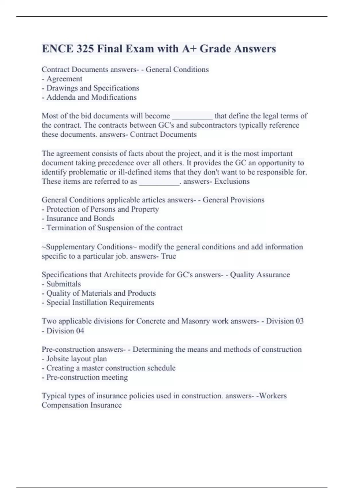 Contract Documents answers- - General Conditions - Agreement - Drawings and Specifications - Addenda and Modifications Most of the bid documents will become __________ that define the legal terms of the contract. The contracts between GC's and subcontractors typically reference these documents. answers- Contract Documents The agreement consists of facts about the project, and it is the most important document taking precedence over all others. It provides the GC an opportunity to identify problematic or ill-defined items that they don't want to be responsible for. These items are referred to as __________. answers- Exclusions General Conditions applicable articles answers- - General Provisions - Protection of Persons and Property - Insurance and Bonds - Termination of Suspension of the contract ~Supplementary Conditions~ modify the general conditions and add information specific to a particular job. answers- True Specifications that Architects provide for GC's answers- - Quality Assurance - Submittals - Quality of Materials and Products - Special Instillation Requirements Two applicable divisions for Concrete and Masonry work answers- - Division 03 - Division 04 Pre-construction answers- - Determining the means and methods of construction - Jobsite layout plan - Creating a master construction schedule - Pre-construction meeting Typical types of insurance policies used in construction. answers- -Workers Compensation Insurance