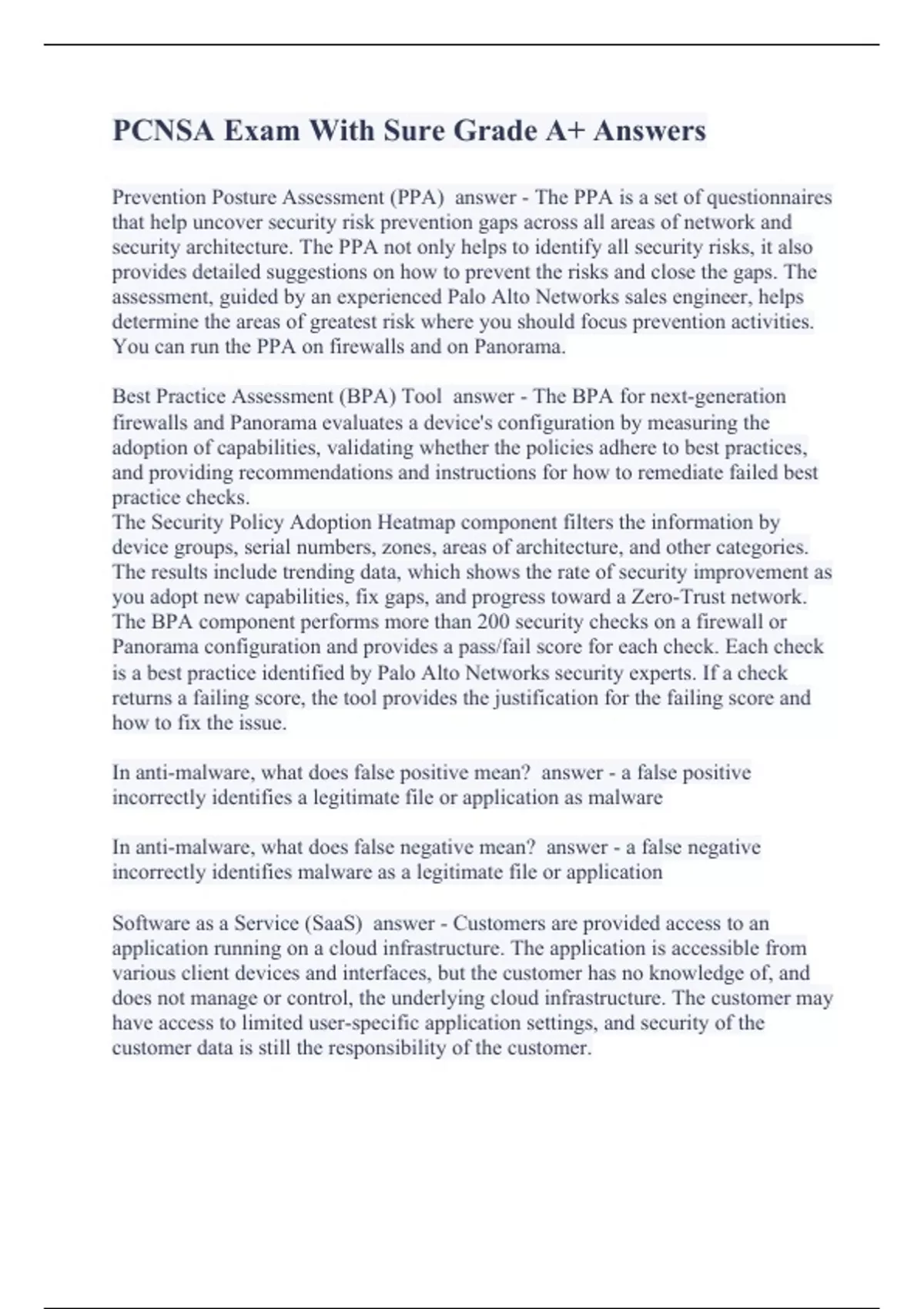 Prevention Posture Assessment (PPA) answer - The PPA is a set of questionnaires that help uncover security risk prevention gaps across all areas of network and security architecture. The PPA not only helps to identify all security risks, it also provides detailed suggestions on how to prevent the risks and close the gaps. The assessment, guided by an experienced Palo Alto Networks sales engineer, helps determine the areas of greatest risk where you should focus prevention activities. You can run the PPA on firewalls and on Panorama. Best Practice Assessment (BPA) Tool answer - The BPA for next-generation firewalls and Panorama evaluates a device's configuration by measuring the adoption of capabilities, validating whether the policies adhere to best practices, and providing recommendations and instructions for how to remediate failed best practice checks. The Security Policy Adoption Heatmap component filters the information by device groups, serial numbers, zones, areas of architecture, and other categories. The results include trending data, which shows the rate of security improvement as you adopt new capabilities, fix gaps, and progress toward a Zero-Trust network. The BPA component performs more than 200 security checks on a firewall or Panorama configuration and provides a pass/fail score for each check. Each check is a best practice identified by Palo Alto Networks security experts. If a check returns a failing score, the tool provides the justification for the failing score and how to fix the issue. In anti-malware, what does false positive mean? answer - a false positive incorrectly identifies a legitimate file or application as malware In anti-malware, what does false negative mean? answer - a false negative incorrectly identifies malware as a legitimate file or application Software as a Service (SaaS) answer - Customers are provided access to an application running on a cloud infrastructure. The application is accessible from various client devices and interfaces, but the customer has no knowledge of, and does not manage or control, the underlying cloud infrastructure. The customer may have access to limited user-specific application settings, and security of the customer data is still the responsibility of the customer.