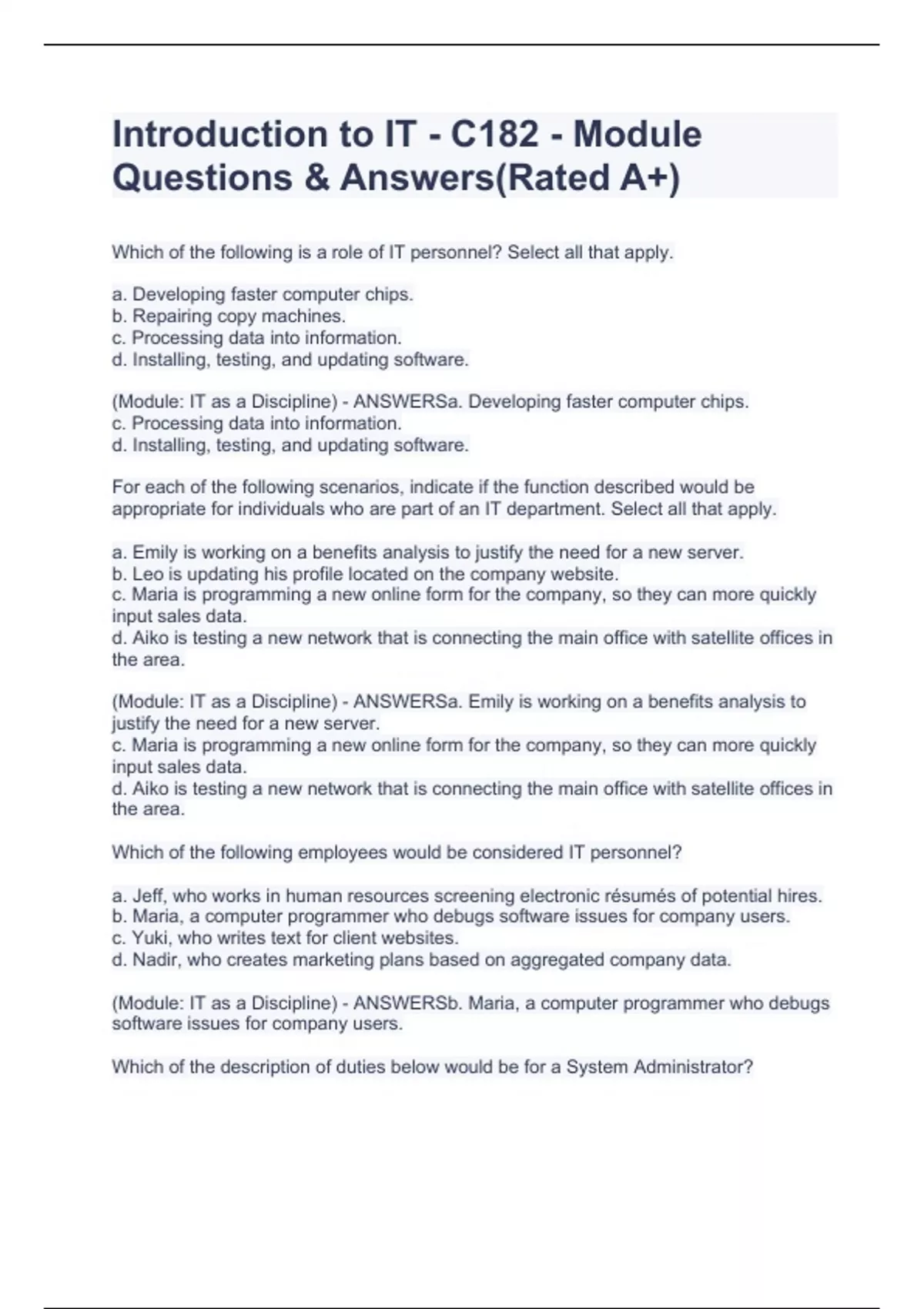 Which of the following is a role of IT personnel? Select all that apply. a. Developing faster computer chips. b. Repairing copy machines. c. Processing data into information. d. Installing, testing, and updating software. (Module: IT as a Discipline) - ANSWERSa. Developing faster computer chips. c. Processing data into information. d. Installing, testing, and updating software. For each of the following scenarios, indicate if the function described would be appropriate for individuals who are part of an IT department. Select all that apply. a. Emily is working on a benefits analysis to justify the need for a new server. b. Leo is updating his profile located on the company website. c. Maria is programming a new online form for the company, so they can more quickly input sales data. d. Aiko is testing a new network that is connecting the main office with satellite offices in the area. (Module: IT as a Discipline) - ANSWERSa. Emily is working on a benefits analysis to justify the need for a new server. c. Maria is programming a new online form for the company, so they can more quickly input sales data. d. Aiko is testing a new network that is connecting the main office with satellite offices in the area. Which of the following employees would be considered IT personnel? a. Jeff, who works in human resources screening electronic résumés of potential hires. b. Maria, a computer programmer who debugs software issues for company users. c. Yuki, who writes text for client websites. d. Nadir, who creates marketing plans based on aggregated company data. (Module: IT as a Discipline) - ANSWERSb. Maria, a computer programmer who debugs software issues for company users.