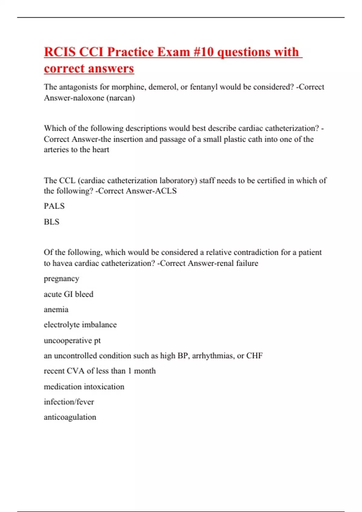 The antagonists for morphine, demerol, or fentanyl would be considered? -Correct Answer-naloxone (narcan) Which of the following descriptions would best describe cardiac catheterization? -Correct Answer-the insertion and passage of a small plastic cath into one of the arteries to the heart The CCL (cardiac catheterization laboratory) staff needs to be certified in which of the following? -Correct Answer-ACLS PALS BLS Of the following, which would be considered a relative contradiction for a patient to havea cardiac catheterization? -Correct Answer-renal failure pregnancy acute GI bleed anemia electrolyte imbalance uncooperative pt an uncontrolled condition such as high BP, arrhythmias, or CHF recent CVA of less than 1 month medication intoxication infection/fever anticoagulation In the cardiac catheterization suite, which of