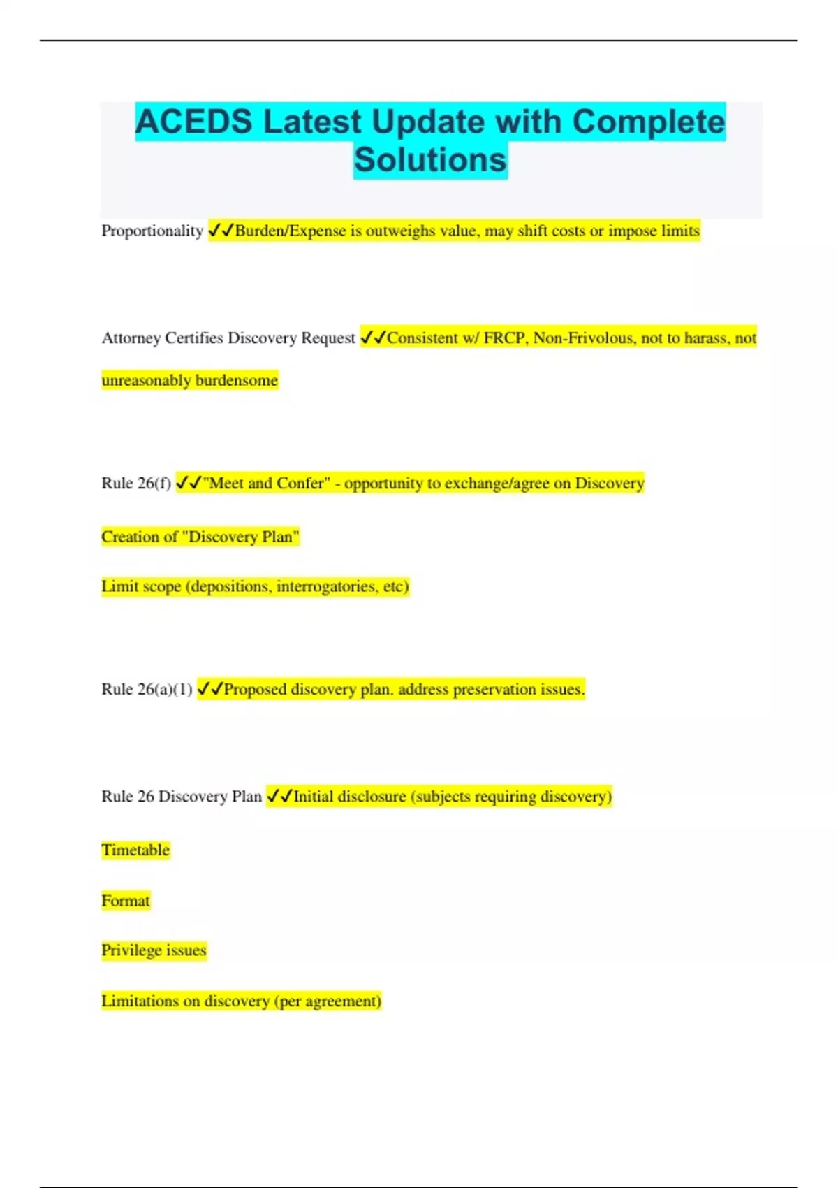 ACEDS Latest Update with Complete Solutions Proportionality Burden/Expense is outweighs value, may shift costs or impose limits Attorney Certifies Discovery Request Consistent w/ FRCP, Non-Frivolous, not to harass, not unreasonably burdensome Rule 26(f) "Meet and Confer" - opportunity to exchange/agree on Discovery Creation of "Discovery Plan" Limit scope (depositions, interrogatories, etc) Rule 26(a)(1) Proposed discovery plan. address preservation issues. Rule 26 Discovery Plan Initial disclosure (subjects requiring discovery) Timetable Format Privilege issues Limitations on discovery (per agreement) Clawback agreements Rule 26 Discovery Plan (2) May list particular issues and agree on timing (e.g. production schedule) or broader initial discovery to narrow later. Early Data Assessment Preliminary assessment of data. Evaluation of systems, custodian data, other evidence. Sort out critical / non-critical groupings Is not early case assessment Helps to : Assess costs Choose Technologies Address at 26(f) conference Merits of case before doc review Decide whether to settle / litigate FRCP 26(b)(1) Provides guidance on cost shifting. "reasonableness" Rule 26(b)(2)(B) Not reasonable accessible - due to "undue burden or cost" Requires "Good Cause" Documenting Preservation Complete & accurate records: Witness interview notes Copies of org charts Legal Hold notice Evidence of distribution Follow-Up actions Records Management What is the Records Management policy? Purpose & schedule Litigation Hold always supercededs Backup Media Back-Up policies, schedule, restore time, impact on metadata, etc Preservation Begins with a litigation hold. Immediate obligation to preserve ESI Steps to prevent ESI from being overwritten Litigation Hold Anticipation of litigation Reasonable steps to preserve May result in spoliation Spoliation - Potential impacts Adverse inference jury instruction Limiting claims or defenses Monetary Award default judgment or dismissal Custodian individual likely to hold relevant content Types of ESI email storage devices PC's Network storage Private storage (e.g. home PC, external media) Social Networking sites. Non-Custodial ESI Not "owned" by a particular individual Structured or Unstructured data Databases WIKI's Shared Network locations Must identify someone responsible for each resource Preservation - Non-Custodial ESI Understand how each source operates Is it overwritten / cumulative ? Is it accessed by multiple people? Litigation Hold Plan 1. Have it in-place before Litigation ensues a. identify personnel and responsibilities b. Written policy and forms available c. Tracking procedure in-place (e.g. ticketing) Legal Hold Written notice description of subject matter examples of ESI storage locations Clear instructions, anticipate problems POC for questions Confirmation/Acknowledgement of Hold Rule 37(e) Replacement of "Safe Harbor" provision No sanction if replacable IF prejudiced - No greater than to cure Rule 37(e) - continued IF intent to deprive: adverse inference dismiss / enter judgment Negligence is not sufficient for severe sanction Deletion of Data What does "deleted" mean? Hard vs. Soft delete Collection - aspects Who, what, when, how? Targeted vs. Broad collection Active vs. Forensic Collections - Metadata Regardless, metadata must be collected. System: last modified/accessed or location File: author info / edit Collection - general repeatable, defensible strategy chain of custody documentation testimony of personnel hash values, if necessary Aspects of Collection (challenges) Cloud computing, web-based email, social media depends on possession, custody or control directed to owner of the data Databases - Collections DB collects, organizes & presents information - standard or custom report - export of selected data fields - export of all data fields Relies on communication / coordination btwn DBA TAR - Seeding It depends on the tool used. Preservation - Social Media Do not delete account, instead download what's available and use sparingly