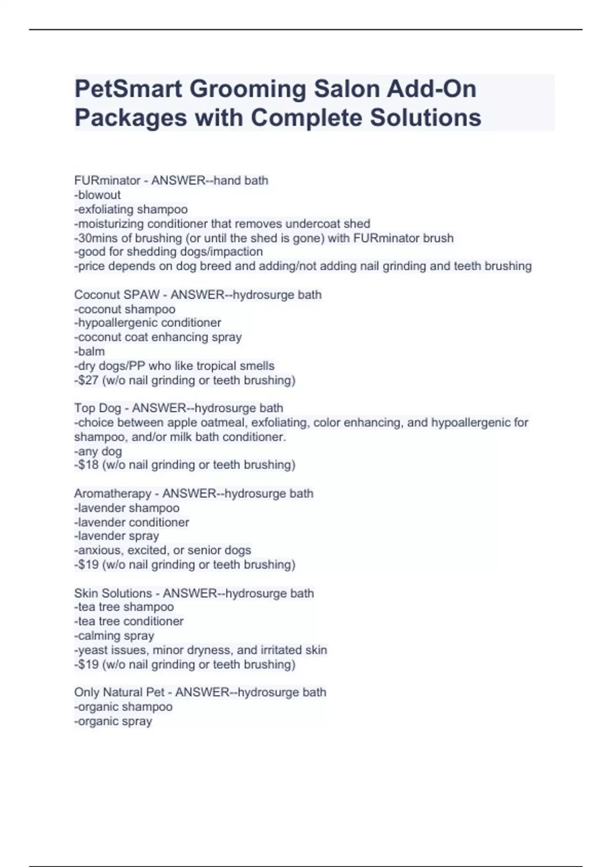 PetSmart Grooming Salon Add-On Packages with Complete Solutions PetSmart Grooming Salon Add-On Packages with Complete Solutions PetSmart Grooming Salon Add-On Packages with Complete Solutions PetSmart Grooming Salon Add-On Packages with Complete Solutions FURminator - ANSWER--hand bath -blowout -exfoliating shampoo -moisturizing conditioner that removes undercoat shed -30mins of brushing (or until the shed is gone) with FURminator brush -good for shedding dogs/impaction -price depends on dog breed and adding/not adding nail grinding and teeth brushing Coconut SPAW - ANSWER--hydrosurge bath -coconut shampoo