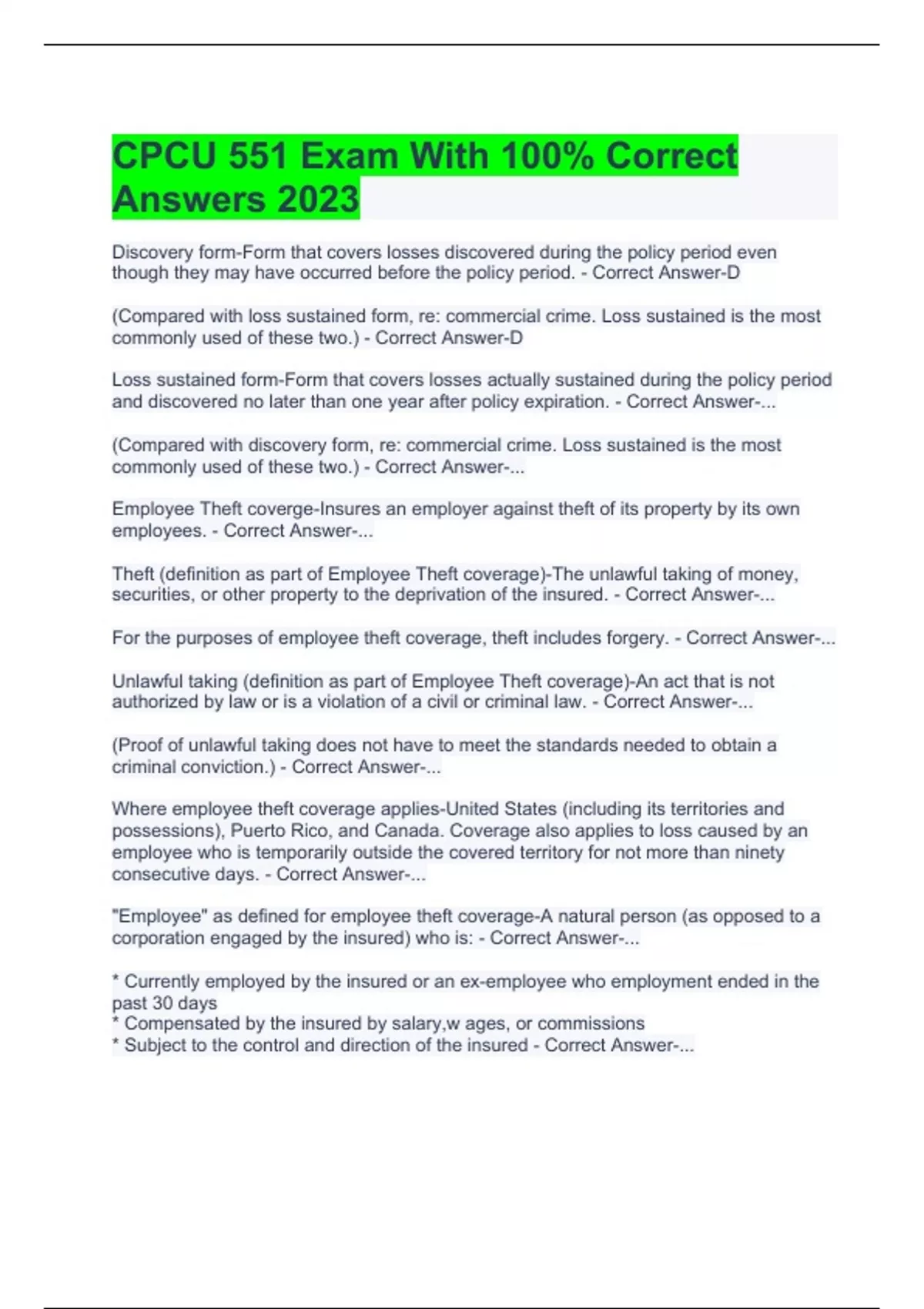 cpcu 551 exam with 100 correct answers 2023