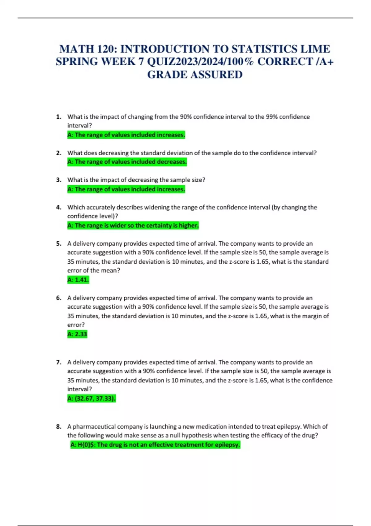 MATH 120: INTRODUCTION TO STATISTICS WEEK 7 EXAM 2023/2024/100% CORRECT /A+ GRADE ASSURED
