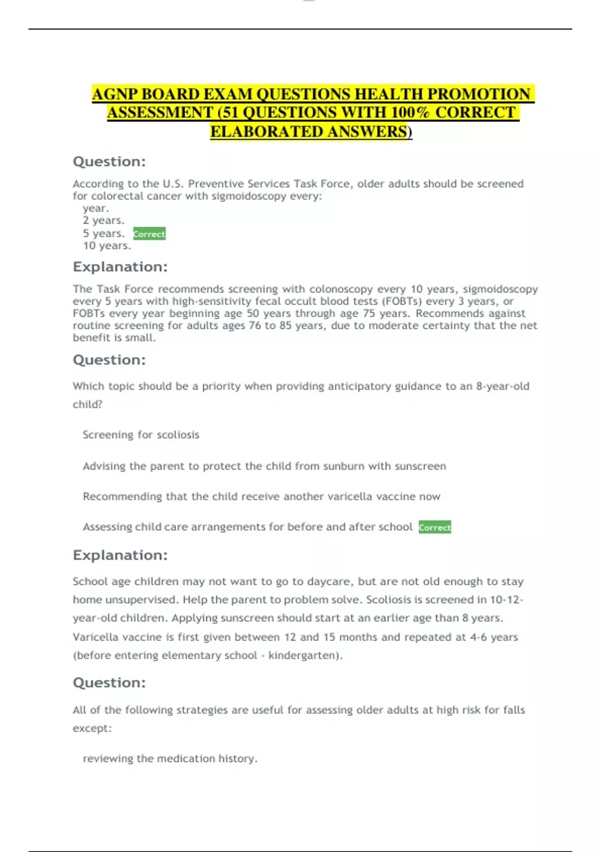 AGNP BOARD EXAM QUESTIONS HEALTH PROMOTION ASSESSMENT (51 QUESTIONS WITH 100% CORRECT ELABORATED ANSWERS)