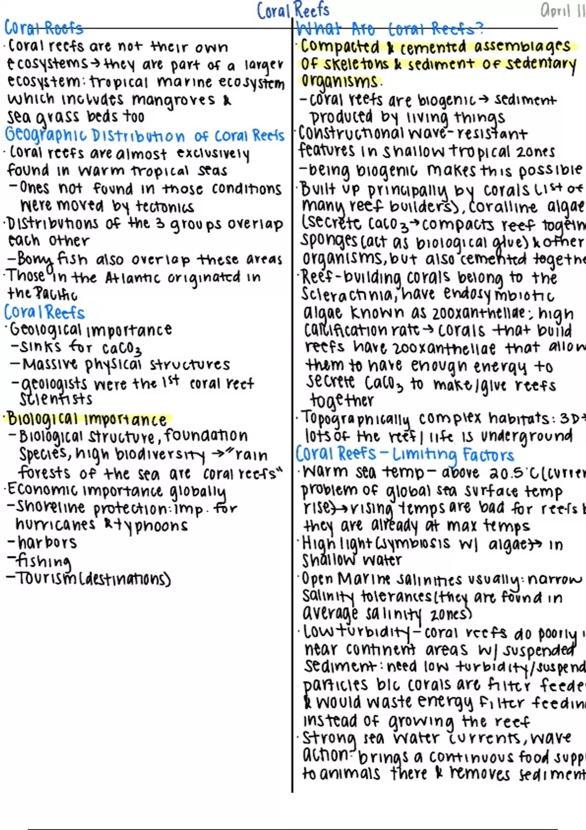 Lecture notes including information on Coral reefs
