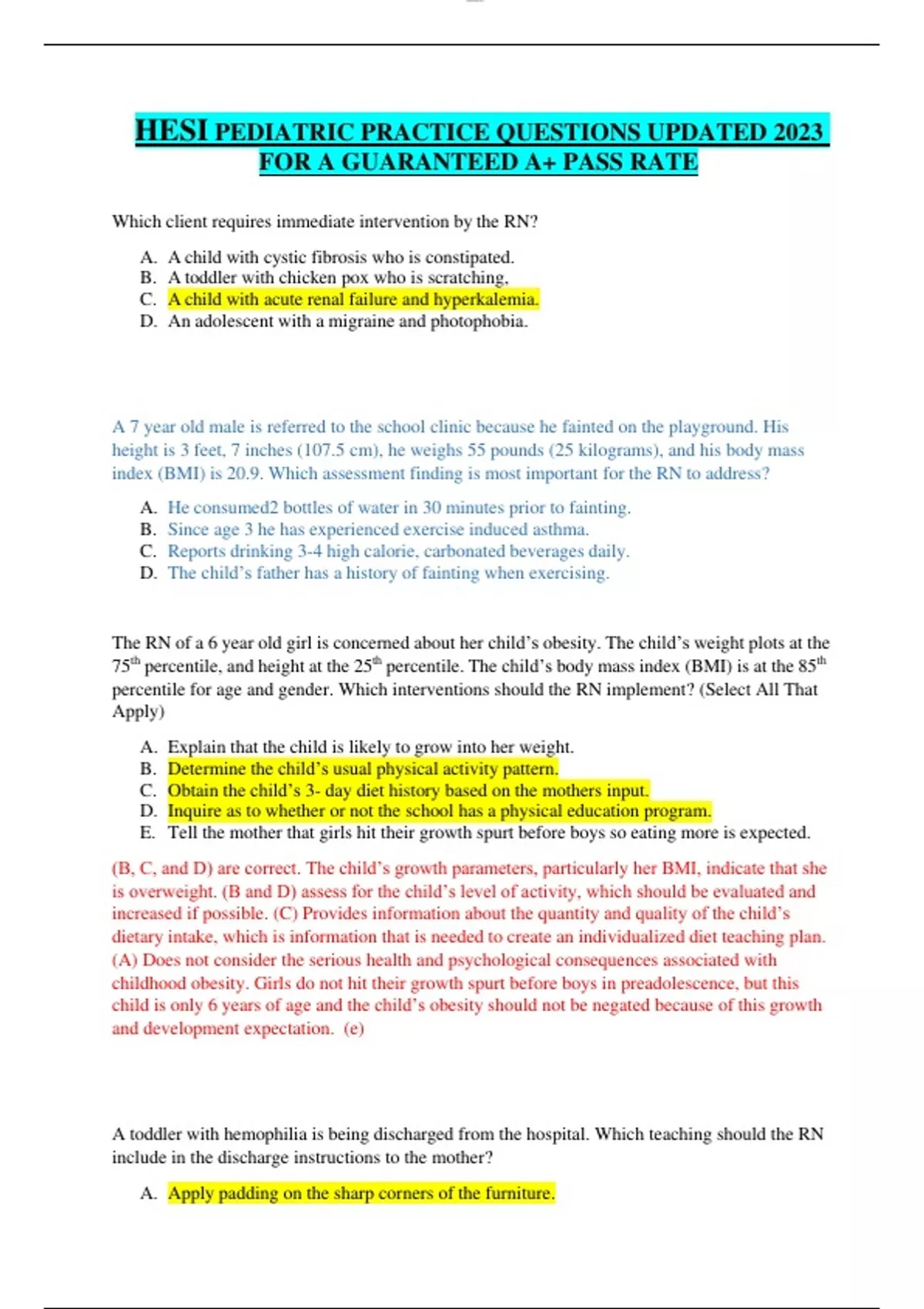 HESI PEDIATRIC PRACTICE QUESTIONS UPDATED 2023 FOR A GUARANTEED A+ PASS RATE