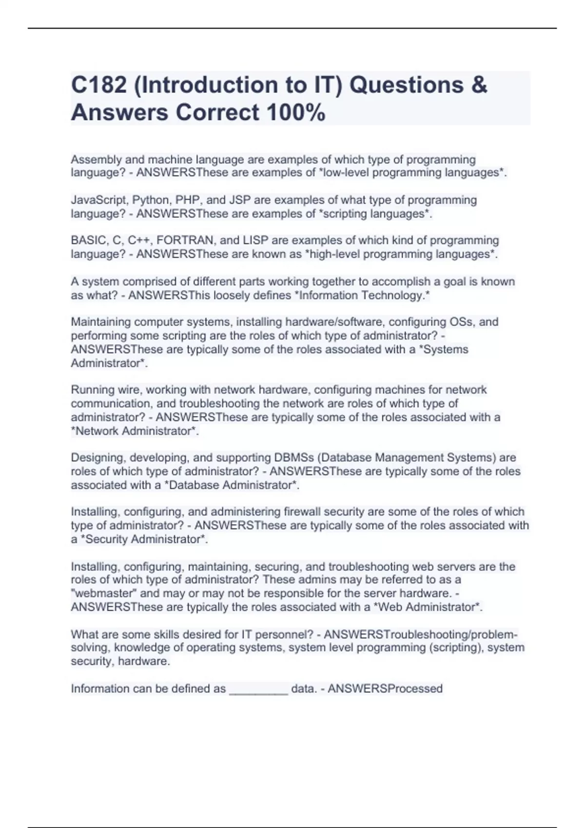 Assembly and machine language are examples of which type of programming language? - ANSWERSThese are examples of *low-level programming languages*. JavaScript, Python, PHP, and JSP are examples of what type of programming language? - ANSWERSThese are examples of *scripting languages*. BASIC, C, C++, FORTRAN, and LISP are examples of which kind of programming language? - ANSWERSThese are known as *high-level programming languages*. A system comprised of different parts working together to accomplish a goal is known as what? - ANSWERSThis loosely defines *Information Technology.* Maintaining computer systems, installing hardware/software, configuring OSs, and performing some scripting are the roles of which type of administrator? - ANSWERSThese are typically some of the roles associated with a *Systems Administrator*. Running wire, working with network hardware, configuring machines for network communication, and troubleshooting the network are roles of which type of administrator? - ANSWERSThese are typically some of the roles associated with a *Network Administrator*. Designing, developing, and supporting DBMSs (Database Management Systems) are roles of which type of administrator? - ANSWERSThese are typically some of the roles associated with a *Database Administrator*. Installing, configuring, and administering firewall security are some of the roles of which type of administrator? - ANSWERSThese are typically some of the roles associated with a *Security Administrator*. Installing, configuring, maintaining, securing, and troubleshooting web servers are the roles of which type of administrator? These admins may be referred to as a "webmaster" and may or may not be responsible for the server hardware. - ANSWERSThese are typically the roles associated with a *Web Administrator*. What are some skills desired for IT personnel? - ANSWERSTroubleshooting/problem-solving, knowledge of operating systems, system level programming (scripting), system security, hardware. C182 (Introduction to IT) Questions & Answers Correct 100%