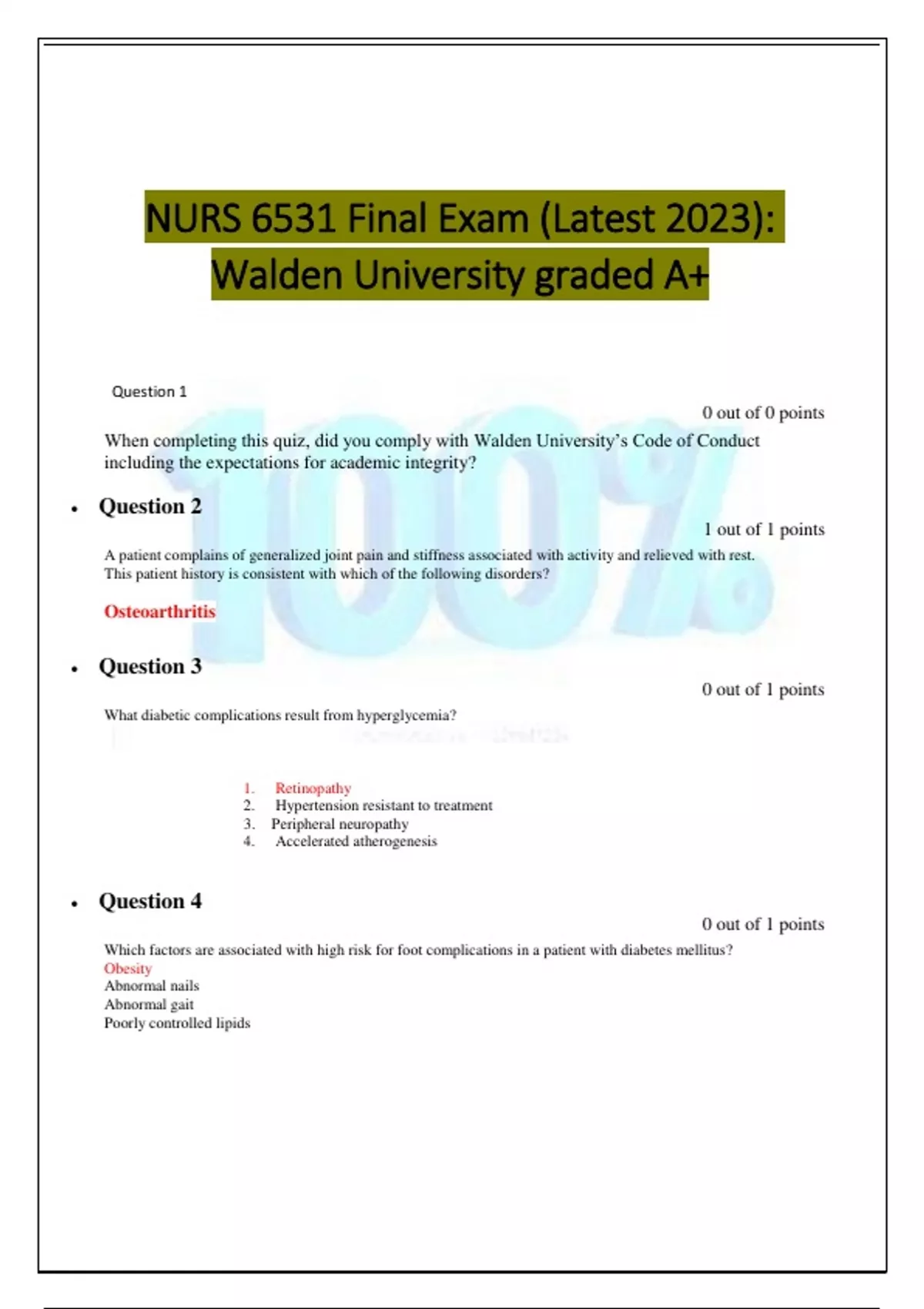 Question 1 0 out of 0 points When completing this quiz, did you comply with Walden University’s Code of Conduct including the expectations for academic integrity? • Question 2 1 out of 1 points A patient complains of generalized joint pain and stiffness associated with activity and relieved with rest. This patient history is consistent with which of the following disorders? Osteoarthritis • Question 3 What diabetic complications result from hyperglycemia? 1. Retinopathy 2. Hypertension resistant to treatment 3. Peripheral neuropathy 4. Accelerated atherogenesis • Question 4 0 out of 1 points 0 out of 1 points Which factors are associated with high risk for foot complications in a patient with diabetes mellitus? Obesity Abnormal nails Abnormal gait Poorly controlled lipids