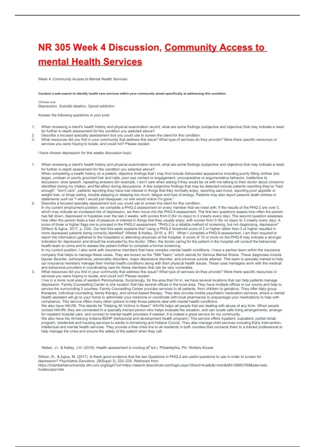 NR 305 Week 4 Discussion, Community Access to mental Health Services Week 4: Community Access to Mental Health Services Conduct a web search to identify health care services within your community aimed specifically at addressing this condition. Choose one: Depression, Suicidal ideation, Opioid addiction Answer the following questions in your post: 1. When reviewing a client's health history and physical examination record, what are some findings (subjective and objective) that may indicate a need for further in-depth assessment for the condition you selected above? 2. Describe a focused specialty assessment tool you could use to screen the client for this condition. 3. What resources did you find in your community that address this issue? What type of services do they provide? Were there specific resources or services you were hoping to locate, and could not? Please explain. I have chosen depression for this weeks discussion topic.