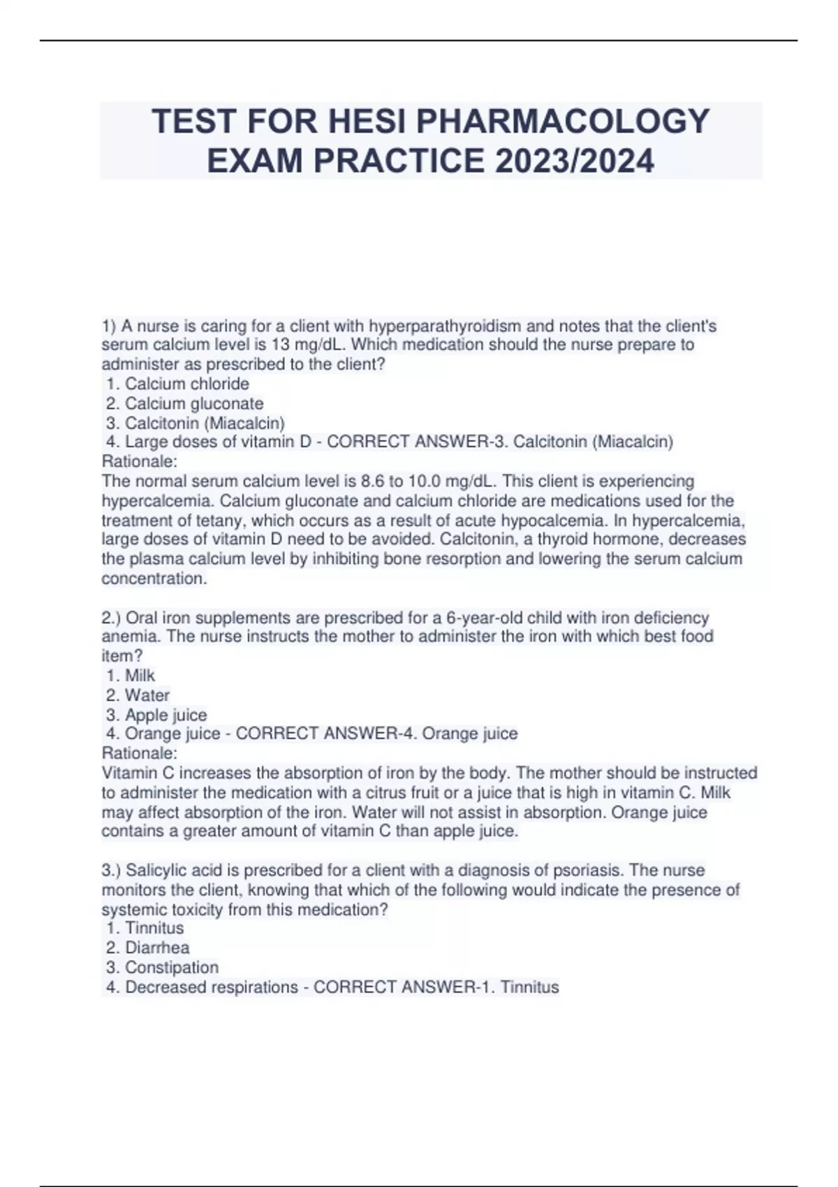 TEST FOR HESI PHARMACOLOGY EXAM PRACTICE 2023/2024 1) A nurse is caring for a client with hyperparathyroidism and notes that the client's serum calcium level is 13 mg/dL. Which medication should the nurse prepare to administer as prescribed to the client? 1. Calcium chloride 2. Calcium gluconate 3. Calcitonin (Miacalcin) 4. Large doses of vitamin D - CORRECT ANSWER-3. Calcitonin (Miacalcin) Rationale: The normal serum calcium level is 8.6 to 10.0 mg/dL. This client is experiencing hypercalcemia. Calcium gluconate and calcium chloride are medications used for the treatment of tetany, which occurs as a result of acute hypocalcemia. In hypercalcemia, large doses of vitamin D need to be avoided. Calcitonin, a thyroid hormone, decreases the plasma calcium level by inhibiting bone resorption and lowering the serum calcium concentration. 2.) Oral iron supplements are prescribed for a 6-year-old child with iron deficiency anemia. The nurse instructs the mother to administer the iron with which best food item? 1. Milk 2. Water 3. Apple juice 4. Orange juice - CORRECT ANSWER-4. Orange juice Rationale: Vitamin C increases the absorption of iron by the body. The mother should be instructed to administer the medication with a citrus fruit or a juice that is high in vitamin C. Milk may affect absorption of the iron. Water will not assist in absorption. Orange juice contains a greater amount of vitamin C than apple juice. 3.) Salicylic acid is prescribed for a client with a diagnosis of psoriasis. The nurse monitors the client, knowing that which of the following would indicate the presence of systemic toxicity from this medication? 1. Tinnitus 2. Diarrhea 3. Constipation 4. Decreased respirations - CORRECT ANSWER-1. Tinnitus Rationale: Salicylic acid is absorbed readily through the skin, and systemic toxicity (salicylism) can result. Symptoms include tinnitus, dizziness, hyperpnea, and psychological disturbances. Constipation and diarrhea are not associated with salicylism. 4.) The camp nurse asks the children preparing to swim in the lake if they have applied sunscreen. The nurse reminds the children that chemical sunscreens are most effective when applied: 1. Immediately before swimming 2. 15 minutes before exposure to the sun 3. Immediately before exposure to the sun 4. At least 30 minutes before exposure to the sun - CORRECT ANSWER-4. At least 30 minutes before exposure to the sun Rationale: Sunscreens are most effective when applied at least 30 minutes before exposure to the sun so that they can penetrate the skin. All sunscreens should be reapplied after swimming or sweating. 5.) Mafenide acetate (Sulfamylon) is prescribed for the client with a burn injury. When applying the medication, the client complains of local discomfort and burning. Which of the following is the most appropriate nursing action? 1. Notifying the registered nurse 2. Discontinuing the medication 3. Informing the client that this is normal 4. Applying a thinner film than prescribed to the burn site - CORRECT ANSWER-3. Informing the client that this is normal Rationale: Mafenide acetate is bacteriostatic for gram-negative and gram-positive organisms and is used to treat burns to reduce bacteria present in avascular tissues. The client should be informed that the medication will cause local discomfort and burning and that this is a normal reaction; therefore options 1, 2, and 4 are incorrect 6.) The burn client is receiving treatments of topical mafenide acetate (Sulfamylon) to the site of injury. The nurse monitors the client, knowing that which of the following indicates that a systemic effect has occurred? 1.Hyperventilation 2.Elevated blood pressure 3.Local pain at the burn site 4.Local rash at the burn site - CORRECT ANSWER-1.Hyperventilation Rationale: Mafenide acetate is a carbonic anhydrase inhibitor and can suppress renal excretion of acid, thereby causing acidosis. Clients receiving this treatment should be monitored for signs of an acid-base imbalance (hyperventilation). If this occurs, the medication should be discontinued for 1 to 2 days. Options 3 and 4 describe local rather than systemic effects. An elevated blood pressure may be expected from the pain that occurs with a burn injury. 7.) Isotretinoin is prescribed for a client with severe acne. Before the administration of this medication, the nurse anticipates that which laboratory test will be prescribed? 1. Platelet count 2. Triglyceride level 3. Complete blood count 4. White blood cell count - CORRECT ANSWER-2. Triglyceride level Rationale: Isotretinoin can elevate triglyceride levels. Blood triglyceride levels should be measured before treatment and periodically thereafter until the effect on the triglycerides has been evaluated. Options 1, 3, and 4 do not need to be monitored specifically during this treatment. 8.) A client with severe acne is seen in the clinic and the health care provider (HCP) prescribes isotretinoin. The nurse reviews the client's medication record and would contact the (HCP) if the client is taking which medication? 1. Vitamin A 2. Digoxin (Lanoxin) 3. Furosemide (Lasix) 4. Phenytoin (Dilantin) - CORRECT ANSWER-1. Vitamin A Rationale: Isotretinoin is a metabolite of vitamin A and can produce generalized intensification of isotretinoin toxicity. Because of the potential for increased toxicity, vitamin A supplements should be discontinued before isotretinoin therapy. Options 2, 3, and 4 are not contraindicated with the use of isotretinoin. 9.) The nurse is applying a topical corticosteroid to a client with eczema. The nurse would monitor for the potential for increased systemic absorption of the medication if the medication were being applied to which of the following body areas? 1. Back 2. Axilla 3. Soles of the feet 4. Palms of the hands - CORRECT ANSWER-2. Axilla Rationale: Topical corticosteroids can be absorbed into the systemic circulation. Absorption is higher from regions where the skin is especially permeable (scalp, axilla, fac
