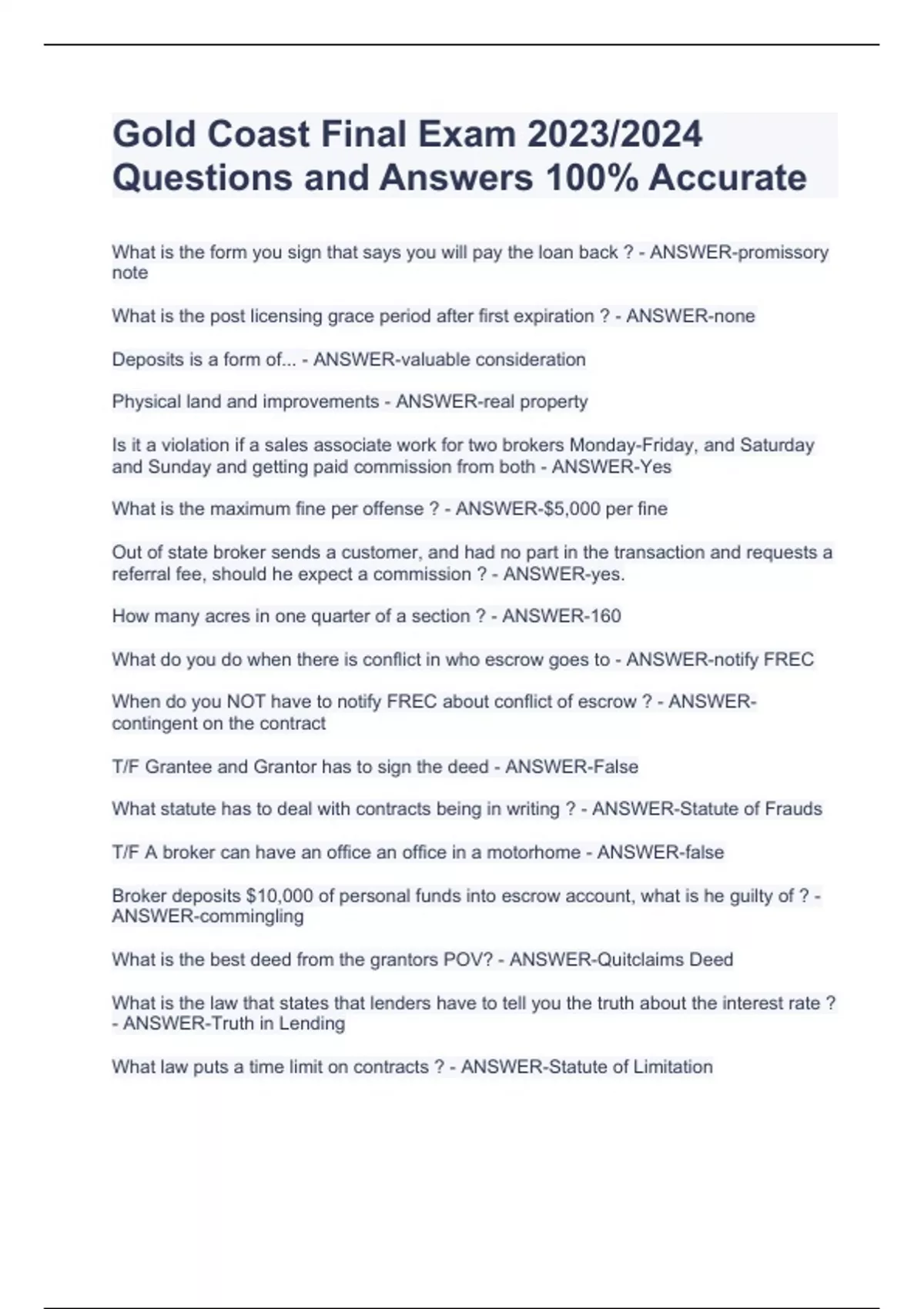 Gold Coast Final Exam 2023/2024 Questions and Answers 100% AccurateGold Coast Final Exam 2023/2024 Questions and Answers 100% AccurateGold Coast Final Exam 2023/2024 Questions and Answers 100% AccurateGold Coast Final Exam 2023/2024 Questions and Answers 100% Accurate What is the form you sign that says you will pay the loan back ? - ANSWER-promissory note What is the post licensing grace period after first expiration ? - ANSWER-none Deposits is a form of... - ANSWER-valuable consideration Physical land and improvements - ANSWER-real property Is it a violation if a sales associate work for two brokers Monday-Friday, and Saturday and Sunday and getting paid commission from both - ANSWER-Yes