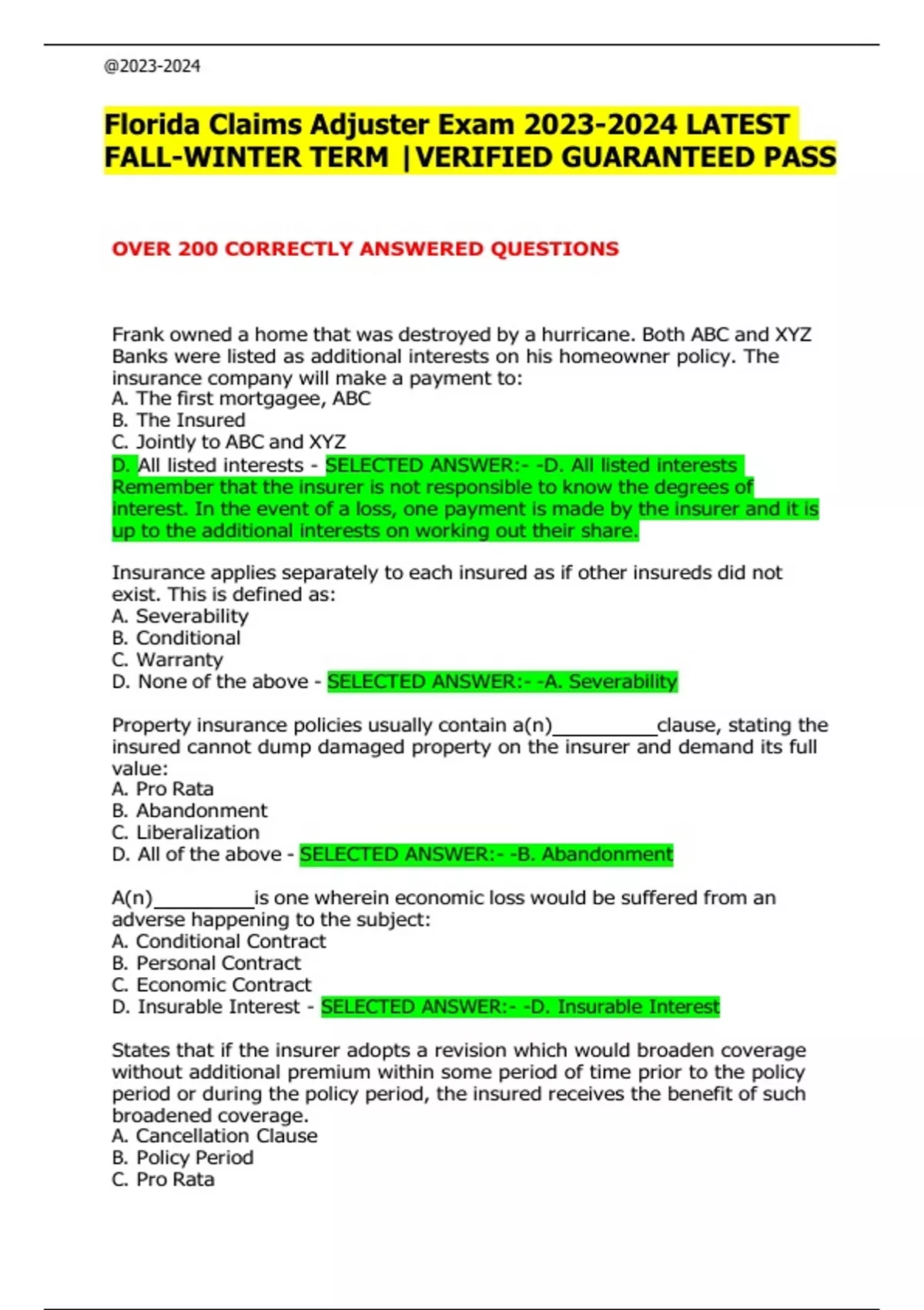 Florida Claims Adjuster Exam LATEST FALL-WINTER TERM |VERIFIED GUARANTEED PASS