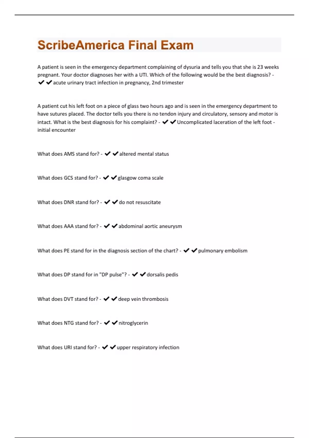 A patient is seen in the emergency department complaining of dysuria and tells you that she is 23 weeks pregnant. Your doctor diagnoses her with a UTI. Which of the following would be the best diagnosis? - acute urinary tract infection in pregnancy, 2nd trimester A patient cut his left foot on a piece of glass two hours ago and is seen in the emergency department to have sutures placed. The doctor tells you there is no tendon injury and circulatory, sensory and motor is intact. What is the best diagnosis for his complaint? - Uncomplicated laceration of the left foot - initial encounter What does AMS stand for? - altered mental status What does GCS stand for? - glasgow coma scale What does DNR stand for? - do not resuscitate What does AAA stand for? - abdominal aortic aneurysm What does PE stand for in the diagnosis section of the chart? - pulmonary embolism What does DP stand for in "DP pulse"? - dorsalis pedis What does DVT stand for? - deep vein thrombosis What does NTG stand for? - nitroglycerin What does URI stand for? - upper respiratory infectionWhat does CHF stand for? - congestive heart failure