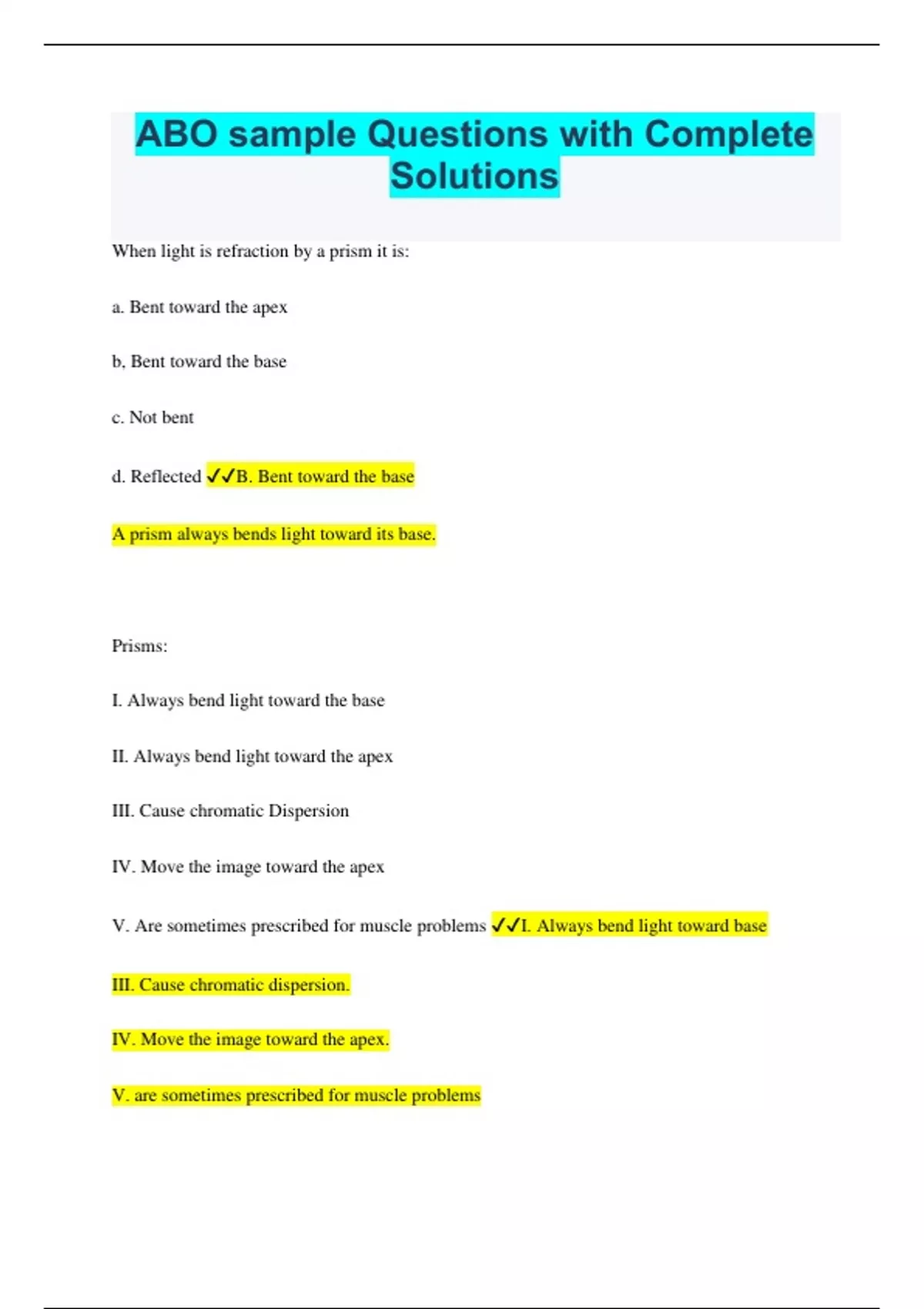 ABO sample Questions with Complete Solutions When light is refraction by a prism it is: a. Bent toward the apex b, Bent toward the base c. Not bent d. Reflected B. Bent toward the base A prism always bends light toward its base. Prisms: I. Always bend light toward the base II. Always bend light toward the apex III. Cause chromatic Dispersion IV. Move the image toward the apex V. Are sometimes prescribed for muscle problems I. Always bend light toward base III. Cause chromatic dispersion. IV. Move the image toward the apex. V. are sometimes prescribed for muscle problems Plus lenses are: I. are thicker in the center than at the edges II. Are used to correct myopia III. Are used by all presbyopes IV. Must be surfaced individually in the laboratory I. Are thicker in the center than at the edges. Which of the following does not describe a minus lens a, The image moves with motion b. Thicker at the edge than in the center c. Magnifies the image d. Corrects for myopia c. A minus lens minifies, not maginfies The parts of the eye that refract light are: a. Cornea, Aqueous humor, lens and vitreous humor b. Cornea, Iris, and lens c.Retina, choriod, lens, and aqueous humor d. cornea, lens, and pupil A. Cornea, Aqueous humor, lens and vitreous humor. Where the sclera and the cornea meet is called the