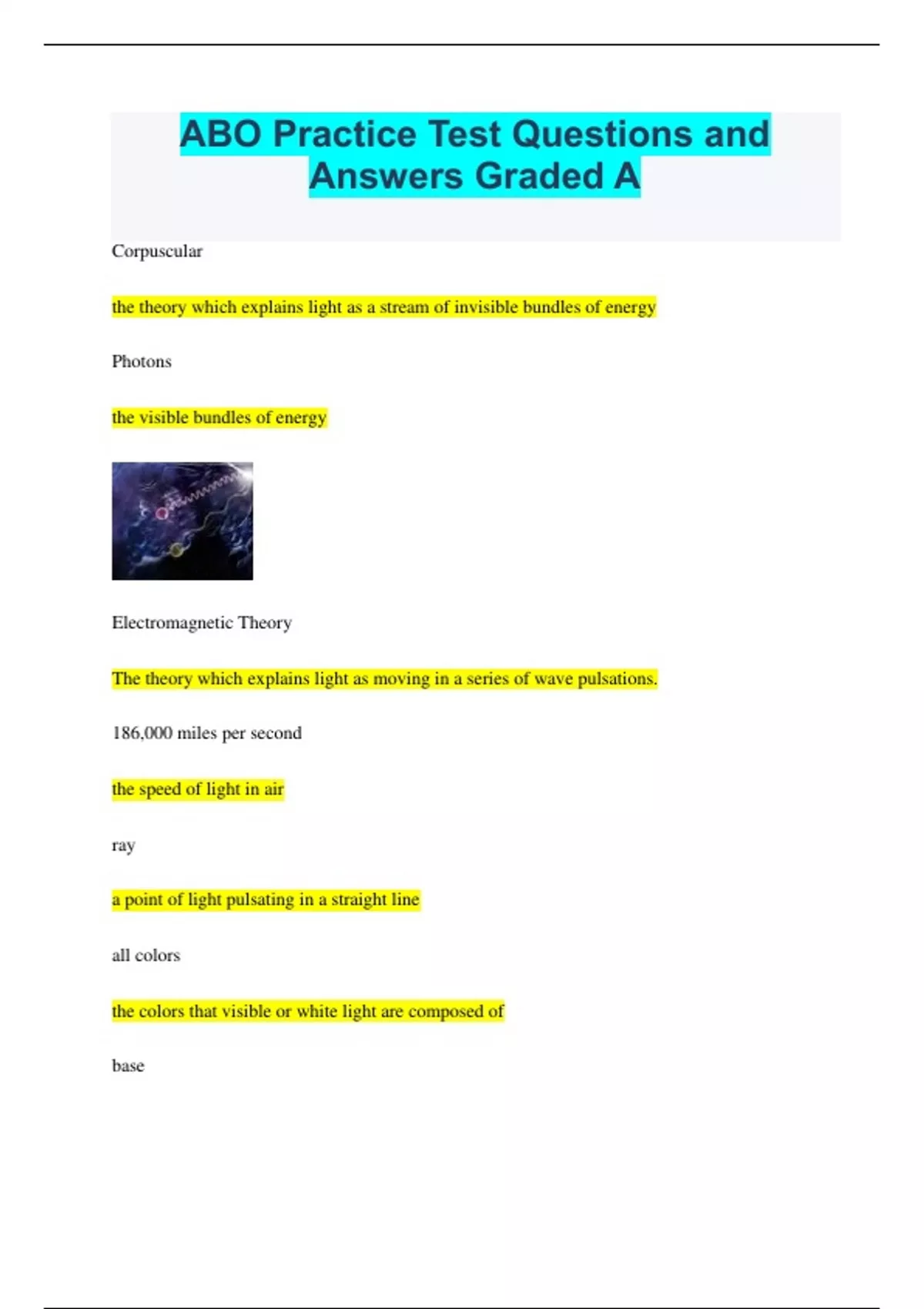 ABO Practice Test Questions and Answers Graded A Corpuscular the theory which explains light as a stream of invisible bundles of energy Photons the visible bundles of energy Electromagnetic Theory The theory which explains light as moving in a series of wave pulsations. 186,000 miles per second the speed of light in air ray a point of light pulsating in a straight line all colors the colors that visible or white light are composed of base a prism will bend light towards its one meter one diopter prism will deviate a ray of light one centimeter in a distance of apex the image being viewed through prism will always be displaced towards its refraction the bending of light as it passed from a medium of lesser density to a medium of greater density is known as refractive index the speed of light in air divided by the speed of light in a material optical center the single point on an optical lens through which light may pass without being deviated converging/against motion plus lenses can be characterized by these two attributes diverging/with motion minus lenses can be characterized by these two attributes minus spheres simple myopia or nearsightedness can be corrected with these type of lenses plus spheres simple hyperopia or farsightedness can be corrected with these type of lenses cylinder lenses an eye which requires a different correction in different meridians can be corrected with these type of lenses 530 mm the radius of curvature of a one diopter lens +1.75 The total power of a lens with a +6.00 diopter front surface and a -4.25 diopter back surface lens. two plus surfaces a biconvex lens 1 meter the focal length of a one diopter lens +3.00 +2.00 x 005 the correction transposition of the following rx: +5.00 -2.00 x 095 out the pupillary distance ground too wide for a plus Rx will result with this type of prism base out the pupillary distance ground too narrow for a minus rx will result with this type of prism base base in and base in this combination of prism is not a canceling situation base up and base up this combination of prism is not a compounding situation radius of curvature not an element of the Prentice Rule formula 1.5 diopters the resulting total prismatic effect of a pair of 3 diopter spheres that is 5mm too wide plano the total power of the following rx at an 180 axis: +2.00 -2.00 x 090 +/- 2 degrees the tolerance for a cylinder of 1.62 diopters or greater 2/3 diopters the recommended limit for horizontal prism tint this will not affect lens thickness effective diameter this is twice as long as the given radius of any shape saggital value or sag an indictor of lens thickness closet distance between lenses DBL "A" Box measurement referring to the horizontal straight line between the farthest nasal and the farthest temporal point of a lens reads base curves not a function of the lensometer reticle the concentric circle configuration within the scope of the lensometer front side the bifocal add must be read with this side on the lens against the lens stop binocular the pd measurement which indicated the distance from the center of the pupil to the center of pupil monocular this type of PD best compensates for facial asymmetry upper right You are looking at a right lens in the lensometer. The Rx call for 1 BU and 2 BI. You find the optical center in this quadrant. -7.50 A lens has a front curve of +6.50. What back curve would yield a corrective power of -1.00? -6.50;-7.50 If a lens has a front curve of +4.50 which back curves would be required to create a lens with a power of -2.00 -1.00 x 180? 0.1766m A +3.00 diopter lens has this radius of curvature. violet The component of visible light has the shortest wavelength. apex to apex Minus lenses are though as two prisms or as a series as these. compound hyperopic astigmatism The following rx corrects this type of visual condition. +2.00 -1.50 x 180 OU steeper As plus power increases the base curves selected result in this effect on the lens. 25 cm +4.00 diopter lens has this focal length 1/diopters focal length formula optic nerve Visual images are transmitted to the brain via this pathway. infrared This portion of the electromagnetic spectrum falls just beyond the longest wavelengths of the visible spectrum. monel a non-hypoallergenic frame material 1.586 refractive index of polycarbonate lens width the A measurement in the boxing system calipers unit of measurement for lens thickness retroscopic tilt frame eyewires are closer to the brow than the ceeks The Food & Drug Administration requires impact resistance test for dress eyewear 0.56 ounces the weight of the steel ball used to test glass lenses in the drop ball test for dress eyewear distometer measures vertex distance Prentice's Rule (D*decentration)/10 spherical equivalent formula power times 0.5 prentice's rule used to calculate prismatic effect minifies the characteristic of a minus lens cornea and sclera the limbus is in conjunction with these two slow down when rays of light go from a medium a less density to a more dense medium they do this 450 nm to 495 nm the blue portion of light is between this two on the visible spectrum in exotropia might be corrected with base in this direction BUMM acronym used for remembering in which lens slab off in ground into and what direction the base is BUMM= base up most minus less chromatic aberration the higher the abbe value segment the base curve of a multifocal lens is measured here Jaeger chart used to check near vision aniseikonia unequal image sizes of the two retina wet/dry the two types of macular degeneration trivex the most impact resistance lens apex of the cornea a distometer measure the distance from the back surface of a spectacle lens to vertex compensation formula P squared times the mm moved divided by 1000 at the dot beneath the fitting cross where prism is verified in PALS down direction of the prism in reverse slab off zyl common named used for cellulose acetate hyperopia a shorter eyeball than normal horizon