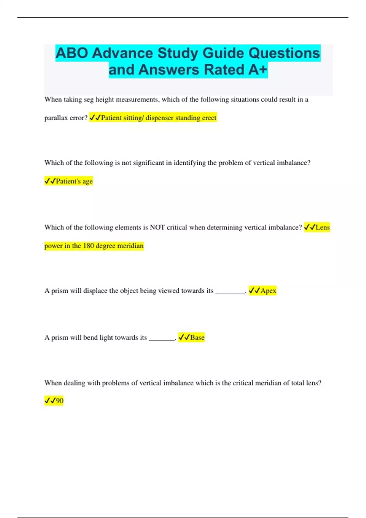 ABO Advance Study Guide Questions and Answers Rated A+ When taking seg height measurements, which of the following situations could result in a parallax error? Patient sitting/ dispenser standing erect Which of the following is not significant in identifying the problem of vertical imbalance? Patient's age Which of the following elements is NOT critical when determining vertical imbalance? Lens power in the 180 degree meridian A prism will displace the object being viewed towards its ________. Apex A prism will bend light towards its _______. Base When dealing with problems of vertical imbalance which is the critical meridian of total lens? 90 Which of the following prescriptions would pose the greatest prismatic imbalance at a reading depth of 10mm? OD +2.50 OS -0.25 +2.50 x 090 A plus lens moved downward from the primary position will result in: Base down prismatic effect What is a hereditary pigmentary degeneration of the retina called which results in gradual loss of peripheral vision? Retinitis pigmentosa What is ocular hypertension? Elevation of pressure in the eye above the range considered with an detectable changes in vision or damage to the structure of the eye. or Eye pressure can be elevated and cause damage in some eyes, but no damage in others. Which of the following statements is false regarding corneal ulcers? Corneal ulcers can be ________. of little concern Approximately what percentage of humans have some alterations in lens transparency after age 65? 60% What type of cataract is a fully developed opacity of the lens with fluid generation and swelling of the lens volume? Hypermature Which of the following statements is false regarding cataracts? Cataracts will only form in the nucleus of the lens. ________ is the condition in which both eyes have equal refractive power. Insometropia Irregular astigmatism occurs when the principal meridians are not uniform along a major meridian and not uniform along a meridian. They are found at some place other than 90 degree apart. Irregular astigmatism is commonly caused by trauma surgery, or corneal dystrophy. TRUE or FALSE True In poor light, a person sees red light better than blue, which