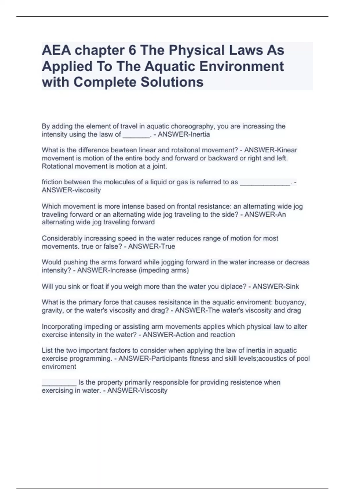 By adding the element of travel in aquatic choreography, you are increasing the intensity using the lasw of _______. - ANSWER-Inertia What is the difference bewteen linear and rotaitonal movement? - ANSWER-Kinear movement is motion of the entire body and forward or backward or right and left. Rotational movement is motion at a joint. friction between the molecules of a liquid or gas is referred to as _____________. - ANSWER-viscosity Which movement is more intense based on frontal resistance: an alternating wide jog traveling forward or an alternating wide jog traveling to the side? - ANSWER-An alternating wide jog traveling forward Considerably increasing speed in the water reduces range of motion for most movements. true or false? - ANSWER-True Would pushing the arms forward while jogging forward in the water increase or decreas intensity? - ANSWER-Increase (impeding arms) Will you sink or float if you weigh more than the water you diplace? - ANSWER-Sink What is the primary force that causes resisitance in the aquatic enviroment: buoyancy, gravity, or the water's viscosity and drag? - ANSWER-The water's viscosity and drag Incorporating impeding or assisting arm movements applies which physical law to alter exercise intensity in the water? - ANSWER-Action and reaction List the two important factors to consider when applying the law of inertia in aquatic exercise programming. - ANSWER-Participants fitness and skill levels;acoustics of pool