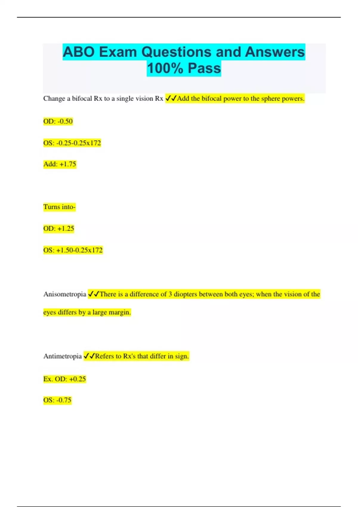 ABO Exam Questions and Answers 100% Pass Change a bifocal Rx to a single vision Rx Add the bifocal power to the sphere powers. OD: -0.50 OS: -0.25-0.25x172 Add: +1.75 Turns into- OD: +1.25 OS: +1.50-0.25x172 Anisometropia There is a difference of 3 diopters between both eyes; when the vision of the eyes differs by a large margin. Antimetropia Refers to Rx's that differ in sign. Ex. OD: +0.25 OS: -0.75 Simple Hyperopia The Rx will be a + sphere Simple Myopia The Rx will be - sphere Marcus Gunn Tests to see if both pupils constrict when a light is shined in one eye. Tests for abnormalties in pupillary reaction. optotypes letters on the Snellen Chart Who is said to be the pioneer lens designer (1268) Roger Bacon Who is generally credited with the invention of spectacles? Salvino d'Armati of Florence, Italy (1285) When were minus or concave lenses invented? 16th century for correction of myopic eyes (nearsightedness) When were toric lenses invented and by whom? 19th century by Suscipi Who is credited with making the first bifocals? Benjamin Franklin (1784) Who aroused the interest of physicians concerning the exam of