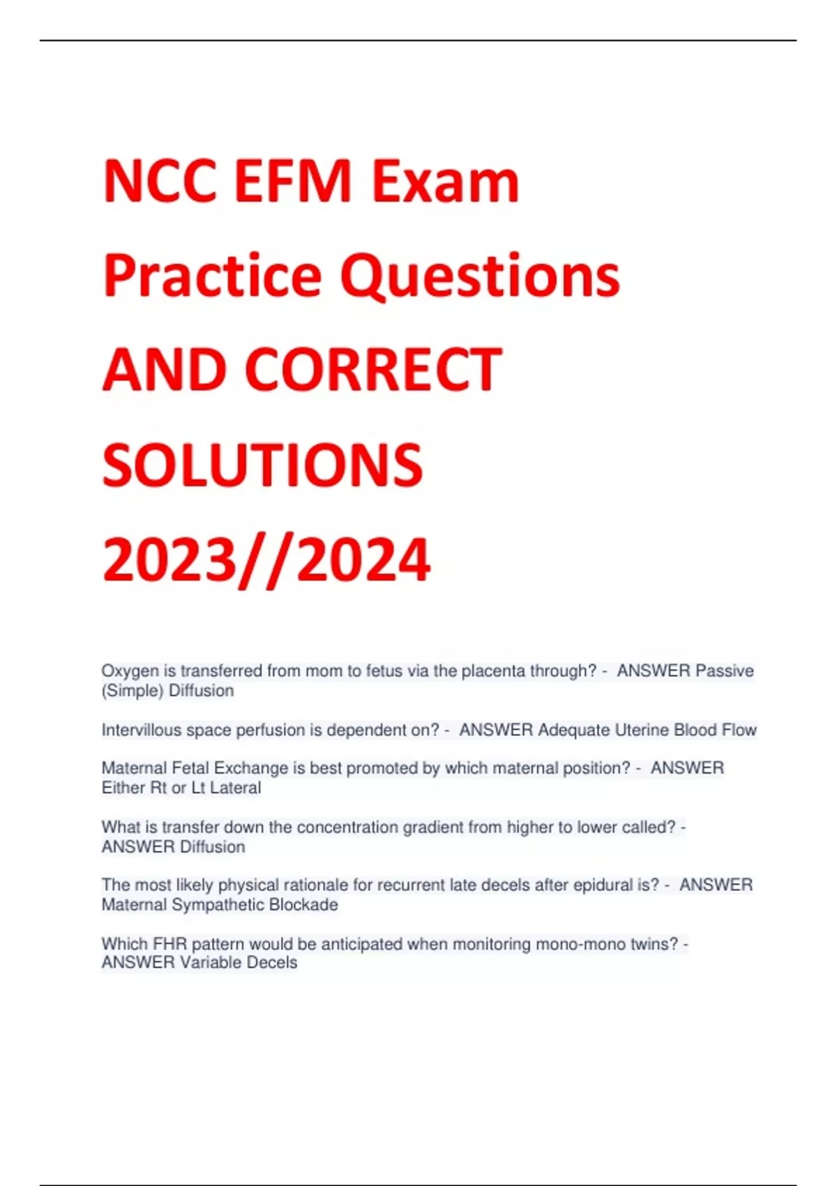 NCC EFM Exam Practice Questions AND CORRECT SOLUTIONS 2023//2024 Oxygen is transferred from mom to fetus via the placenta through? - ANSWER Passive (Simple) Diffusion Intervillous space perfusion is dependent on? - ANSWER Adequate Uterine Blood Flow Maternal Fetal Exchange is best promoted by which maternal position? - ANSWER Either Rt or Lt Lateral What is transfer down the concentration gradient from higher to lower called? - ANSWER Diffusion The most likely physical rationale for recurrent late decels after epidural is? - ANSWER Maternal Sympathetic Blockade Which FHR pattern would be anticipated when monitoring mono-mono twins? - ANSWER Variable Decels Fetus can survive in an environment w/ a PO2 equal to adult venous blood d/t? - ANSWER increased O2 carrying capacity Variable decels are mediated primarily by? - ANSWER baroreceptors The sympathetic branch of the ANS influences FHR to? - ANSWER increase the average difference in baseline FHR b/w 30 & 40 weeks is? - ANSWER 10bpm usually 5-6; 10 is closest Fetal blood is most highly oxygenated in the? - ANSWER Ductus Venosous An abrupt rise in fetal bp can stimulate? - ANSWER variable decels During an acute episode of fetal hypoxemia, fetal blood flow is redistributed primarily to the? - ANSWER brain Over the course of pregnancy, the FHR baseline? - ANSWER decreases FHR variability is dependent upon? - ANSWER cerebral oxygen and intact CNS chemoreceptors respond mainly to? - ANSWER hypoxemia pH: 7.22