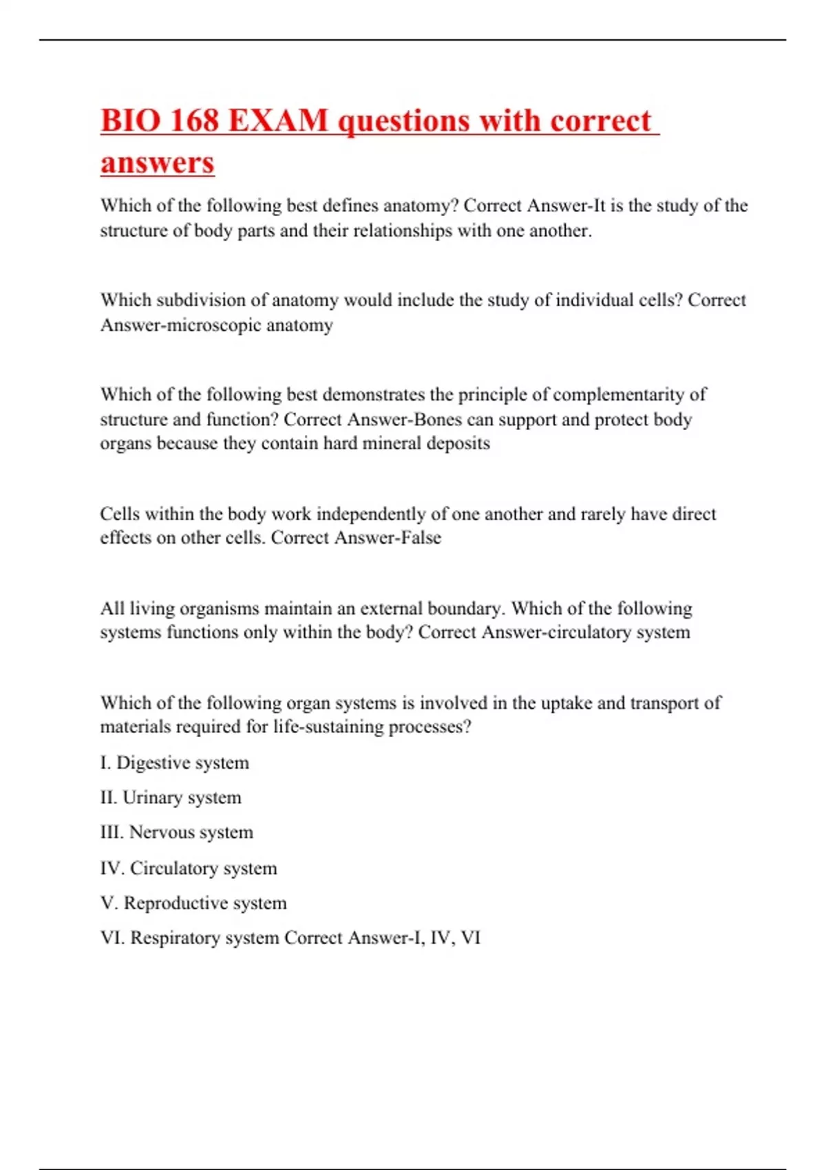 Which of the following best defines anatomy? Correct Answer-It is the study of the structure of body parts and their relationships with one another. Which subdivision of anatomy would include the study of individual cells? Correct Answer-microscopic anatomy Which of the following best demonstrates the principle of complementarity of structure and function? Correct Answer-Bones can support and protect body organs because they contain hard mineral deposits Cells within the body work independently of one another and rarely have direct effects on other cells. Correct Answer-False All living organisms maintain an external boundary. Which of the following systems functions only within the body? Correct Answer-circulatory system Which of the following organ systems is involved in the uptake and transport of materials required for life-sustaining processes? I. Digestive system II. Urinary system III. Nervous system IV. Circulatory system V. Reproductive system VI. Respiratory system Correct Answer-I, IV, VI Digestion includes breaking substances into their simple