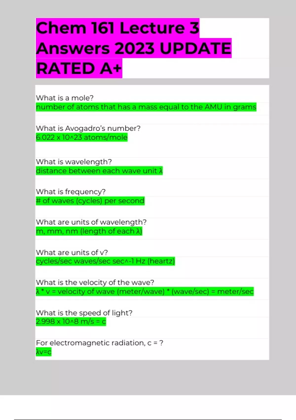 Chem 161 Lecture 3 Answers 2023 UPDATE RATED A+ What is a mole? number of atoms that has a mass equal to the AMU in grams What is Avogadro’s number? 6.022 x 10^23 atoms/mole What is wavelength? distance between each wave unit λ What is frequency? # of waves (cycles) per second What are units of wavelength? m, mm, nm (length of each λ) What are units of v? cycles/sec waves/sec sec^-1 Hz (heartz) What is the velocity of the wave? λ * v = velocity of wave (meter/wave) * (wave/sec) = meter/sec What is the speed of light? 2.998 x 10^8 m/s = c For electromagnetic radiation, c = ? λv=c