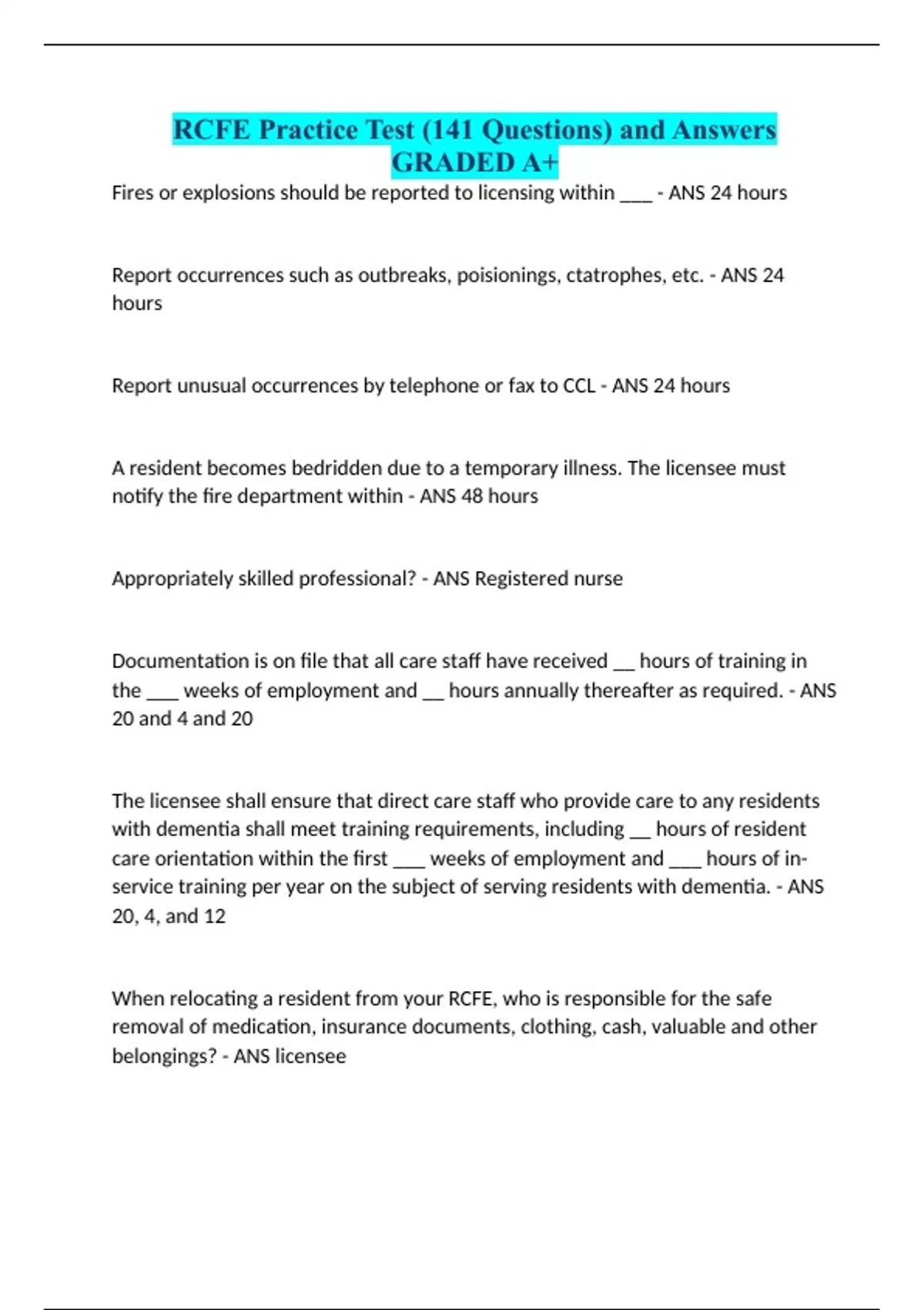 RCFE Practice Test (141 Questions) and Answers GRADED A+ Fires or explosions should be reported to licensing within ___ - ANS 24 hours Report occurrences such as outbreaks, poisionings, ctatrophes, etc. - ANS 24 hours Report unusual occurrences by telephone or fax to CCL - ANS 24 hours A resident becomes bedridden due to a temporary illness. The licensee must notify the fire department within - ANS 48 hours Appropriately skilled professional? - ANS Registered nurse Documentation is on file that all care staff have received __ hours of training in the ___ weeks of employment and __ hours annually thereafter as required. - ANS 20 and 4 and 20 The licensee shall ensure that direct care staff who provide care to any residents with dementia shall meet training requirements, including __ hours of resident care orientation within the first ___ weeks of employment and ___ hours of in-service training per year on the subject of serving residents with dementia. - ANS 20, 4, and 12 When relocating a resident from your RCFE, who is responsible for the safe removal of medication, insurance documents, clothing, cash, valuable and other belongings? - ANS licensee A resident who requires 24