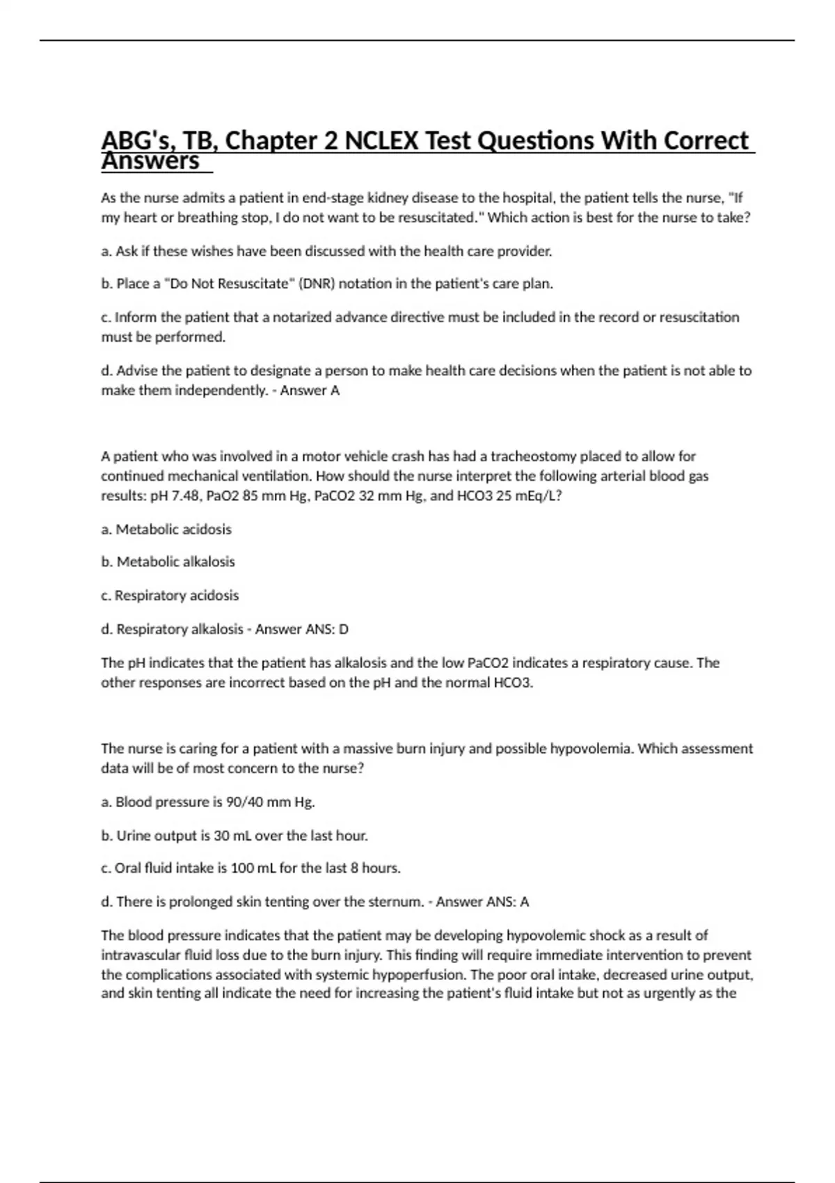 As the nurse admits a patient in end-stage kidney disease to the hospital, the patient tells the nurse, "If my heart or breathing stop, I do not want to be resuscitated." Which action is best for the nurse to take? a. Ask if these wishes have been discussed with the health care provider. b. Place a "Do Not Resuscitate" (DNR) notation in the patient's care plan. c. Inform the patient that a notarized advance directive must be included in the record or resuscitation must be performed. d. Advise the patient to designate a person to make health care decisions when the patient is not able to make them independently. - Answer A A patient who was involved in a motor vehicle crash has had a tracheostomy placed to allow for continued mechanical ventilation. How should the nurse interpret the following arterial blood gas results: pH 7.48, PaO2 85 mm Hg, PaCO2 32 mm Hg, and HCO3 25 mEq/L? a. Metabolic acidosis b. Metabolic alkalosis c. Respiratory acidosis d. Respiratory alkalosis - Answer ANS: D The pH indicates that the patient has alkalosis and the low PaCO2 indicates a respiratory cause. The other responses are incorrect based on the pH and the normal HCO3. The nurse is caring for a patient with a massive burn injury and possible hypovolemia. Which assessment data will be of most concern to the nurse? a. Blood pressure is 90/40 mm Hg. b. Urine output is 30 mL over the last hour. c. Oral fluid intake is 100 mL for the last 8 hours. d. There is prolonged skin tenting over the sternum. - Answer ANS: A The blood pressure indicates that the patient may be developing hypovolemic shock as a result of intravascular fluid loss due to the burn injury. This finding will require immediate intervention to prevent the complications associated with systemic hypoperfusion. The poor oral intake, decreased urine output, and skin tenting all indicate the need for increasing the patient's fluid intake but not as urgently as the hypotension. The home health nurse cares for an alert and oriented older adult patient with a history of dehydration. Which instructions should the nurse give to this patient related to fluid intake? a. "Increase fluids if your mouth feels dry. b. "More fluids are needed if you feel thirsty." c. "Drink more fluids in the late evening hours." d. "If you feel lethargic or confused, you need more to drink." - Answer ANS: A An alert, older patient will be able to self-assess for signs of oral dryness such as thick oral secretions or dry-appearing mucosa. The thirst mechanism decreases with age and is not an accurate indicator of volume depletion. Many older patients prefer to restrict fluids slightly in the evening to improve sleep quality. The patient will not be likely to notice and act appropriately when changes in level of consciousness occur. A patient who is taking a potassium-wasting diuretic for treatment of hypertension complains of generalized weakness. It is most appropriate for the nurse to take which action? a. Assess for facial muscle spasms. b. Ask the patient about loose stools. c. Suggest that the patient avoid orange juice with meals. d. Ask the health care provider to order a basic metabolic panel. - Answer ANS: D Generalized weakness is a manifestation of hypokalemia. After the health care provider orders the metabolic panel, the nurse should check the potassium level. Facial muscle spasms might occur with hypocalcemia. Orange juice is high in potassium and would be advisable to drink if the patient was hypokalemic. Loose stools are associated with hyperkalemia. A newly admitted patient is diagnosed with hyponatremia. When making room assignments, the charge nurse should take which action? a. Assign the patient to a room near the nurse's station. b. Place the patient in a room nearest to the water fountain. c. Place the patient on telemetry to monitor for peaked T waves. d. Assign the patient to a semi-private room and place an order for a low-salt diet. - Answer ANS: A The patient should be placed near the nurse's station if confused in order for the staff to closely monitor the patient. To help improve serum sodium levels, water intake is restricted. Therefore a confused patient should not be placed near a water fountain. Peaked T waves are a sign of hyperkalemia, not hyponatremia. A confused patient could be distracting and disruptive for another patient in a semiprivate room. This patient needs sodium replacement, not restriction. IV potassium chloride (KCl) 60 mEq is prescribed for treatment of a patient with severe hypokalemia. Which action should the nurse take? a. Administer the KCl as a rapid IV bolus. b. Infuse the KCl at a rate of 10 mEq/hour. c. Only give the KCl through a central venous line. d. Discontinue cardiac monitoring during the infusion. - Answer ANS: B IV KCl is administered at a maximal rate of 10 mEq/hr. Rapid IV infusion of KCl can cause cardiac arrest. Although the preferred concentration for KCl is no more than 40 mEq/L, concentrations up to 80 mEq/L may be used for some patients. KCl can cause inflammation of peripheral veins, but it can be administered by this route. Cardiac monitoring should be continued while patient is receiving potassium because of the risk for dysrhythmias. A patient receives 3% NaCl solution for correction of hyponatremia. Which assessment is most important for the nurse to monitor for while the patient is receiving this infusion? a. Lung sounds b. Urinary output c. Peripheral pulses d. Peripheral edema - Answer ANS: A Hypertonic solutions cause water retention, so the patient should be monitored for symptoms of fluid excess. Crackles in the lungs may indicate the onset of pulmonary edema and are a serious manifestation of fluid excess. Bounding peripheral pulses, peripheral edema, or changes in urine output are also important to monitor when administering hypertonic solutions, but they do not indicate acute respiratory or cardiac decompensation. A patient who has been receiving diuretic therapy is admitted to the emergenc