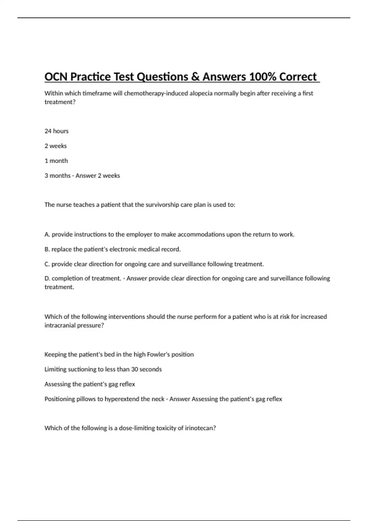 Within which timeframe will chemotherapy-induced alopecia normally begin after receiving a first treatment? 24 hours 2 weeks 1 month 3 months - Answer 2 weeks The nurse teaches a patient that the survivorship care plan is used to: A. provide instructions to the employer to make accommodations upon the return to work. B. replace the patient's electronic medical record. C. provide clear direction for ongoing care and surveillance following treatment. D. completion of treatment. - Answer provide clear direction for ongoing care and surveillance following treatment. Which of the following interventions should the nurse perform for a patient who is at risk for increased intracranial pressure? Keeping the patient's bed in the high Fowler's position Limiting suctioning to less than 30 seconds Assessing the patient's gag reflex Positioning pillows to hyperextend the neck - Answer Assessing the patient's gag reflex Which of the following is a dose-limiting toxicity of irinotecan? Diarrhea Alopecia Miosis Vomiting - Answer diarhhea A patient demonstrates an adequate understanding of the teaching provided regarding chemotherapy and myelosuppression by stating: A. "Myelosuppression is: the overreaction of the body's immune system to a medication." B. unintentional prior to a bone marrow transplant." C. a potential side effect of many cancer treatments." D. when laboratory values show an elevation in the white blood cell count." - Answer A patient receiving a fluorouracil-based combination chemotherapy regimen is employed as a landscaper. The nurse teaches the patient about the risk of: gout. peripheral edema. photosensitivity. pulmonary toxicity. - Answer photosensitivity. Which of the following is released into the bloodstream in the event of tumor lysis syndrome? Uric acid Sodium Magnesium Calcium - Answer uric acid The nurse preparing to instill intravesical mitomycin should wear which of the following pieces of personal protective equipment? A plastic face shield A front-closing laboratory gown One pair of powdered nitrile gloves A pair of shoe covers - Answer A plastic face shield Alkylating agents exert their effects by: A. binding to DNA strands, preventing DNA replication and cell division. B. disrupting folate-dependent metabolic processes essential for cell replication. C. causing the release of toxic free radicals inside the cell, triggering cell apoptosis. D. attaching to CD52 on the surface of B and T cells, resulting in antibody-dependent lysis. - Answer binding to DNA strands, preventing DNA replication and cell division. One year after receiving total body irradiation for a hematopoietic stem cell transplant, a patient reports increasingly dim vision and ocular sensitivity. The nurse suspects which late effect related to treatment? Optic nerve dysfunction Strabismus Cataracts Macular degeneration - Answer cataracts Which of the following conditions will most likely be treated by an allogeneic stem cell transplant? Multiple myeloma Follicular thyroid cancer Hodgkin lymphoma Chronic myeloid leukemia - Answer CML Which of the following is a common and preventable cause of anxiety for a patient with cancer? Spiritual distress Distressing memories Sleep disturbances Uncontrolled pain - Answer pain Oligodendroglial tumors originate from cells that maintain the function of the: plasma. myelin sheath. lymph. synovial fluid. - Answer myelin sheath When a suspected extravasation occurs during the administration of a vesicant, the nurse must first: