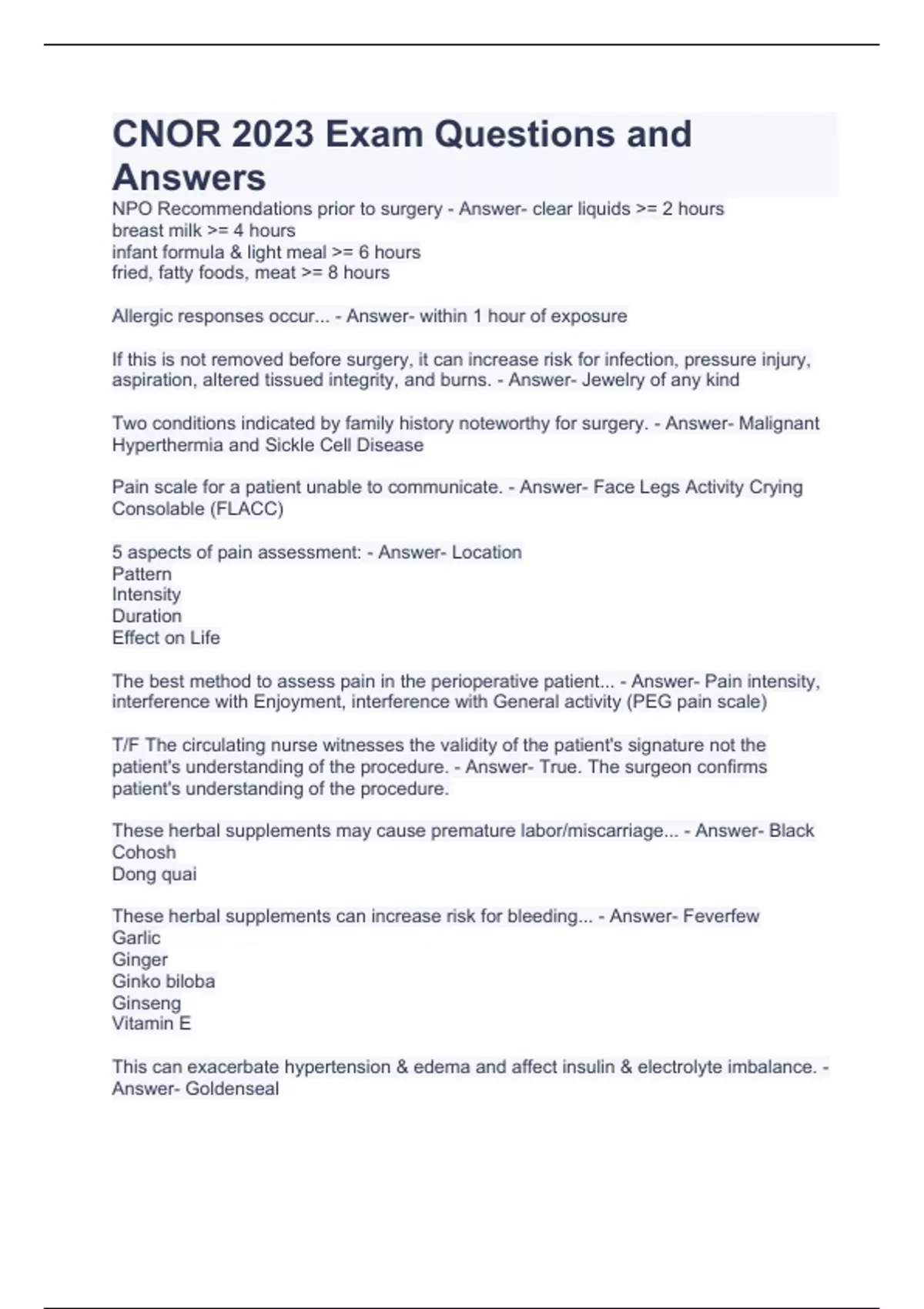 CNOR 2023 Exam Questions and Answers