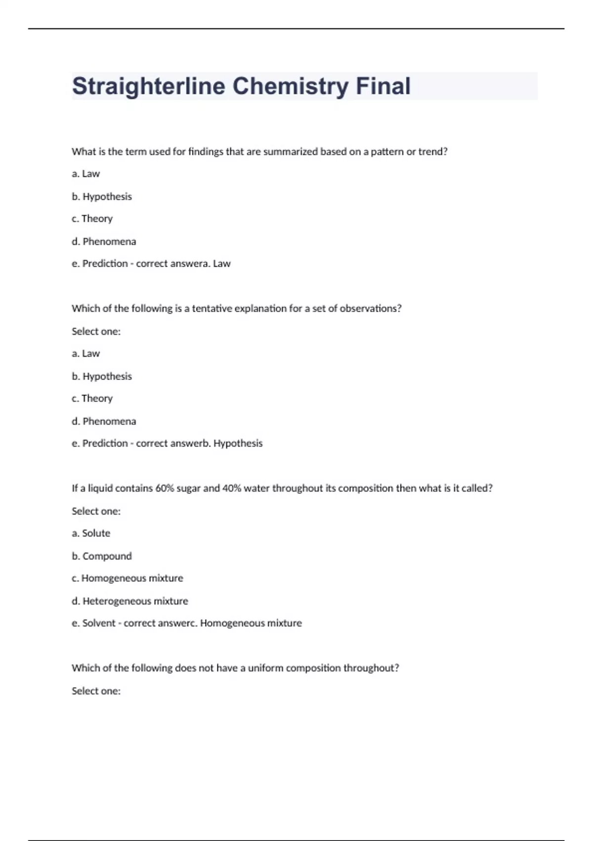 What is the term used for findings that are summarized based on a pattern or trend? a. Law b. Hypothesis c. Theory d. Phenomena e. Prediction - correct answera. Law Which of the following is a tentative explanation for a set of observations? Select one: a. Law b. Hypothesis c. Theory d. Phenomena e. Prediction - correct answerb. Hypothesis If a liquid contains 60% sugar and 40% water throughout its composition then what is it called? Select one: a. Solute b. Compound c. Homogeneous mixture d. Heterogeneous mixture e. Solvent - correct answerc. Homogeneous mixture Which of the following does not have a uniform composition throughout? Se