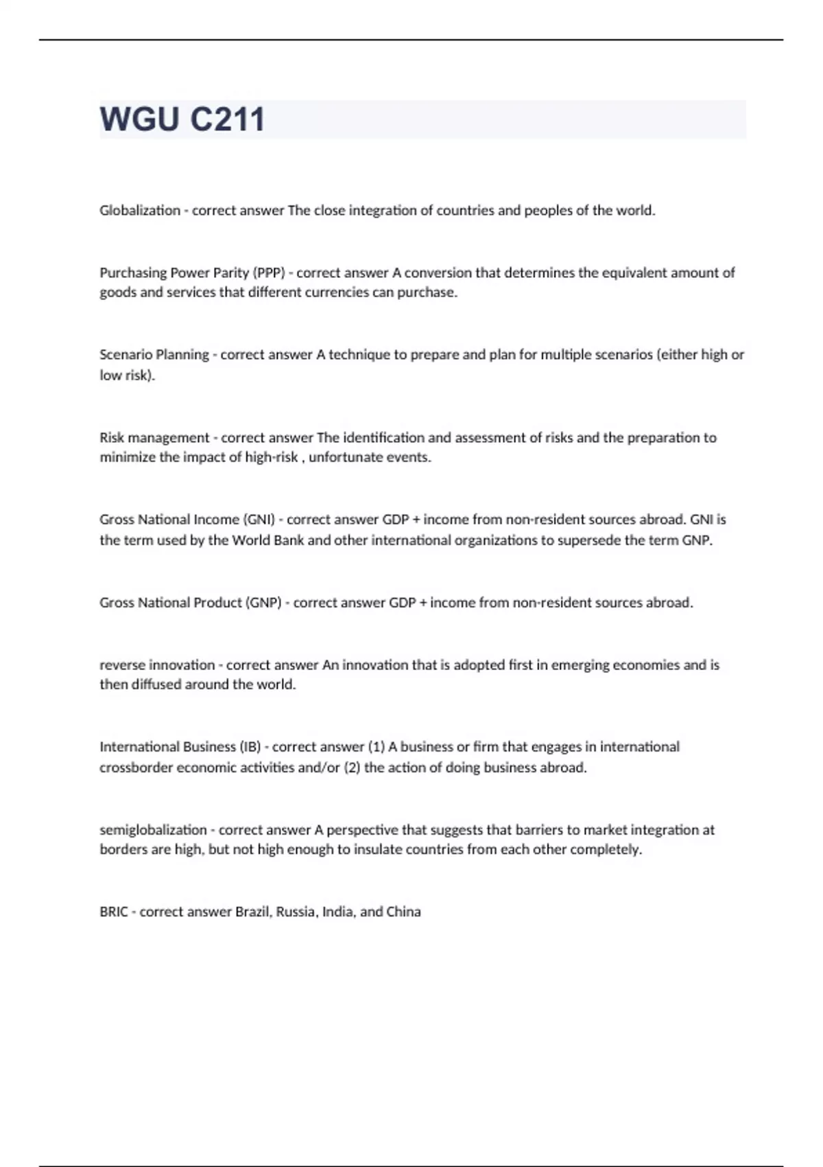 Globalization - correct answer The close integration of countries and peoples of the world. Purchasing Power Parity (PPP) - correct answer A conversion that determines the equivalent amount of goods and services that different currencies can purchase. Scenario Planning - correct answer A technique to prepare and plan for multiple scenarios (either high or low risk). Risk management - correct answer The identification and assessment of risks and the preparation to minimize the impact of high-risk , unfortunate events. Gross National Income (GNI) - correct answer GDP + income from non-resident sources abroad. GNI is the term used by the World Bank and other international organizations to supersede the term GNP. Gross National Product (GNP) - correct answer GDP + income from non-resident sources abroad. reverse innovation - correct answer An innovation that is adopted first in emerging economies and is then diffused around the world. International Business (IB) - correct answer (1) A business or firm that engages in international crossborder economic activities and/or (2) the action of doing business abroad. semiglobalization - correct answer A perspective that suggests that barriers to market integration at borders are high, but not high enough to insulate countries from each other completely. BRIC - correct answer Brazil, Russia, India, and China