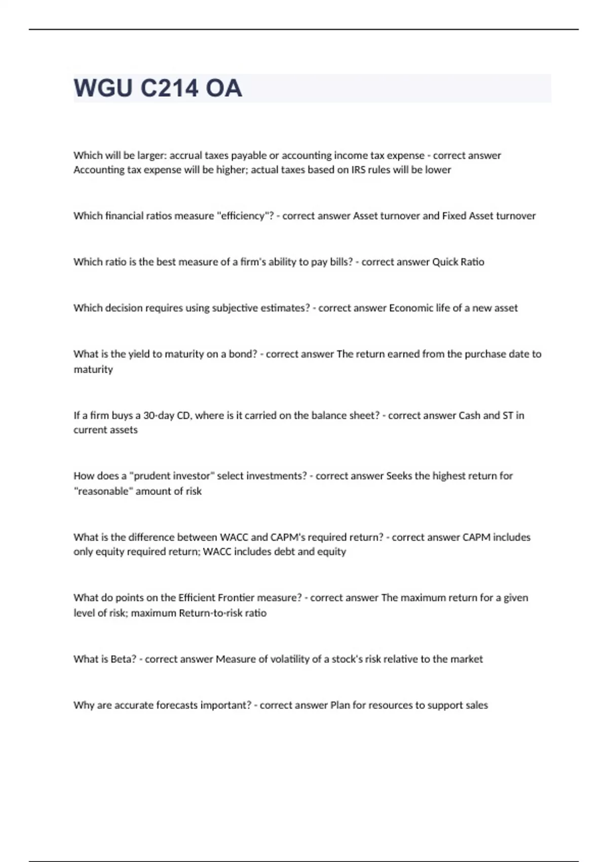 Which will be larger: accrual taxes payable or accounting income tax expense - correct answer Accounting tax expense will be higher; actual taxes based on IRS rules will be lower Which financial ratios measure "efficiency"? - correct answer Asset turnover and Fixed Asset turnover Which ratio is the best measure of a firm's ability to pay bills? - correct answer Quick Ratio Which decision requires using subjective estimates? - correct answer Economic life of a new asset What is the yield to maturity on a bond? - correct answer The return earned from the purchase date to maturity If a firm buys a 30-day CD, where is it carried on the balance sheet? - correct answer Cash and ST in current assets How does a "prudent investor" select investments? - correct answer Seeks the highest return for "r