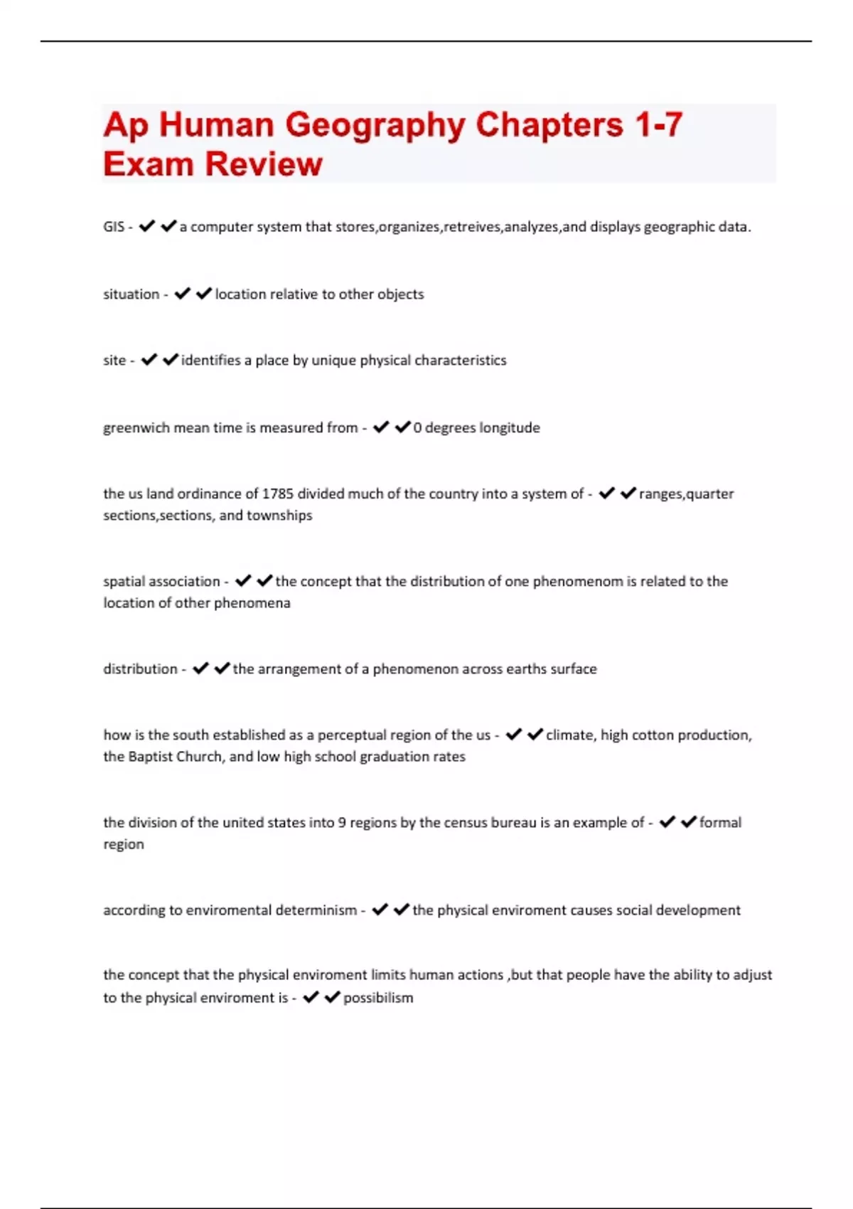 IS - a computer system that stores,organizes,retreives,analyzes,and displays geographic data. situation - location relative to other objects site - identifies a place by unique physical characteristics greenwich mean time is measured from - 0 degrees longitude the us land ordinance of 1785 divided much of the country into a system of - ranges,quarter sections,sections, and townships spatial association - the concept that the distribution of one phenomenom is related to the location of other phenomena distribution - the arrangement of a phenomenon across earths surface how is the south established as a perceptual region of the us - climate, high cotton production, the Baptist Church, and low high school graduation rates the division of the united states into 9 regions by the census bureau is an example of - formal region according to enviromental determinism - the physical enviroment causes social development the concept that the physical enviroment limits human actions ,but that people have the ability to adjust to the physical enviroment is - possibilismthe frequency of something within a given unit of area is - density concentration - the spread of something over a given study area