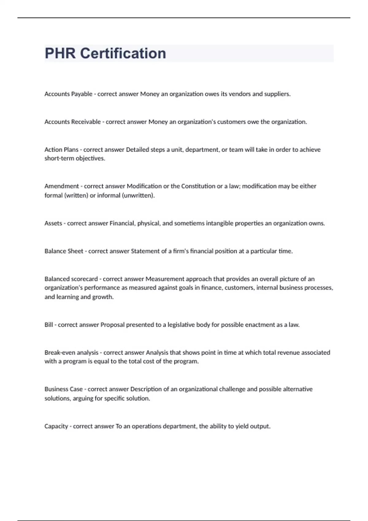 PHR CertificationAccounts Payable - correct answer Money an organization owes its vendors and suppliers. Accounts Receivable - correct answer Money an organization's customers owe the organization. Action Plans - correct answer Detailed steps a unit, department, or team will take in order to achieve short-term objectives. Amendment - correct answer Modification or the Constitution or a law; modification may be either formal (written) or informal (unwritten). Assets - correct answer Financial, physical, and sometiems intangible properties an organization owns. Balance Sheet - correct answer Statement of a firm's financial position at a particular time. Balanced scorecard - correct answer Measurement approach that provides an overall picture of an organization's performance as measured against goals in finance, customers, internal business processes, and learning and growth. Bill - correct answer Proposal presented to a legislative body for possible enactment as a law. Break-even analysis - correct answer Analysis that shows point in time at which total revenue associated with a program is equal to the total cost of the program. Business Case - correct answer Description of an organizational challenge and possible alternative solutions, arguing for specific solution. Capacity - correct answer To an operations department, the ability to yield output.