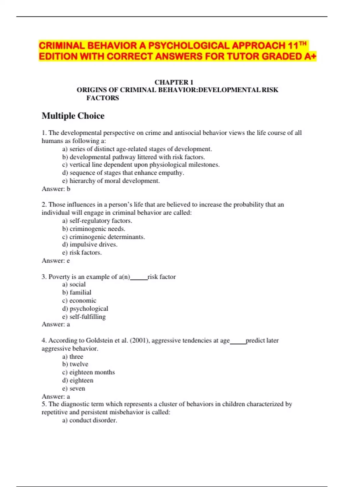 CRIMINAL BEHAVIOR A PSYCHOLOGICAL APPROACH 11TH EDITION WITH CORRECT ANSWERS FOR TUTOR GRADED A+ CHAPTER 1 ORIGINS OF CRIMINAL BEHAVIOR:DEVELOPMENTALRISK FACTORS Multiple Choice 1. The developmental perspective on crime and antisocial behavior views the life course of all humans as following a: a) series of distinct age-related stages of development. b) developmental pathway littered with risk factors. c) vertical line dependent upon physiological milestones. d) sequence of stages that enhance empathy. e) hierarchy of moral development. Answer: b 2. Those influences in a person’s life that are believed to increase the probability that an individual will engage in criminal behavior are called: a) self-regulatory factors. b) criminogenic needs. c) criminogenic determinants. d) impulsive drives. e) risk factors. Answer: e 3. Poverty is an example of a(n) risk factor a) social b) familial c) economic d) psychological e) self-fulfilling Answer: a 4. According to Goldstein et al. (2001), aggressive tendencies at age predict later aggressive behavior. a) three b) twelve c) eighteen months d) eighteen e) seven Answer: a 5. The diagnostic term which represents a cluster of behaviors in children characterized by repetitive and persistent misbehavior is called: a) conduct disorder. b) ADHD. c) antisocial personality disorder. d) psychopathy. e) aggression. Answer: a