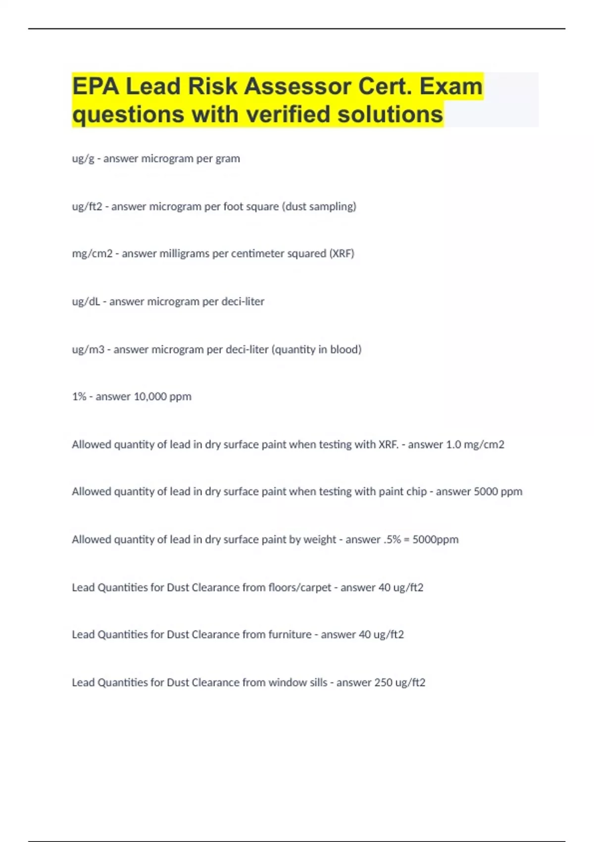Allowed quantity of lead in dry surface paint when testing with XRF. - answer 1.0 mg/cm2