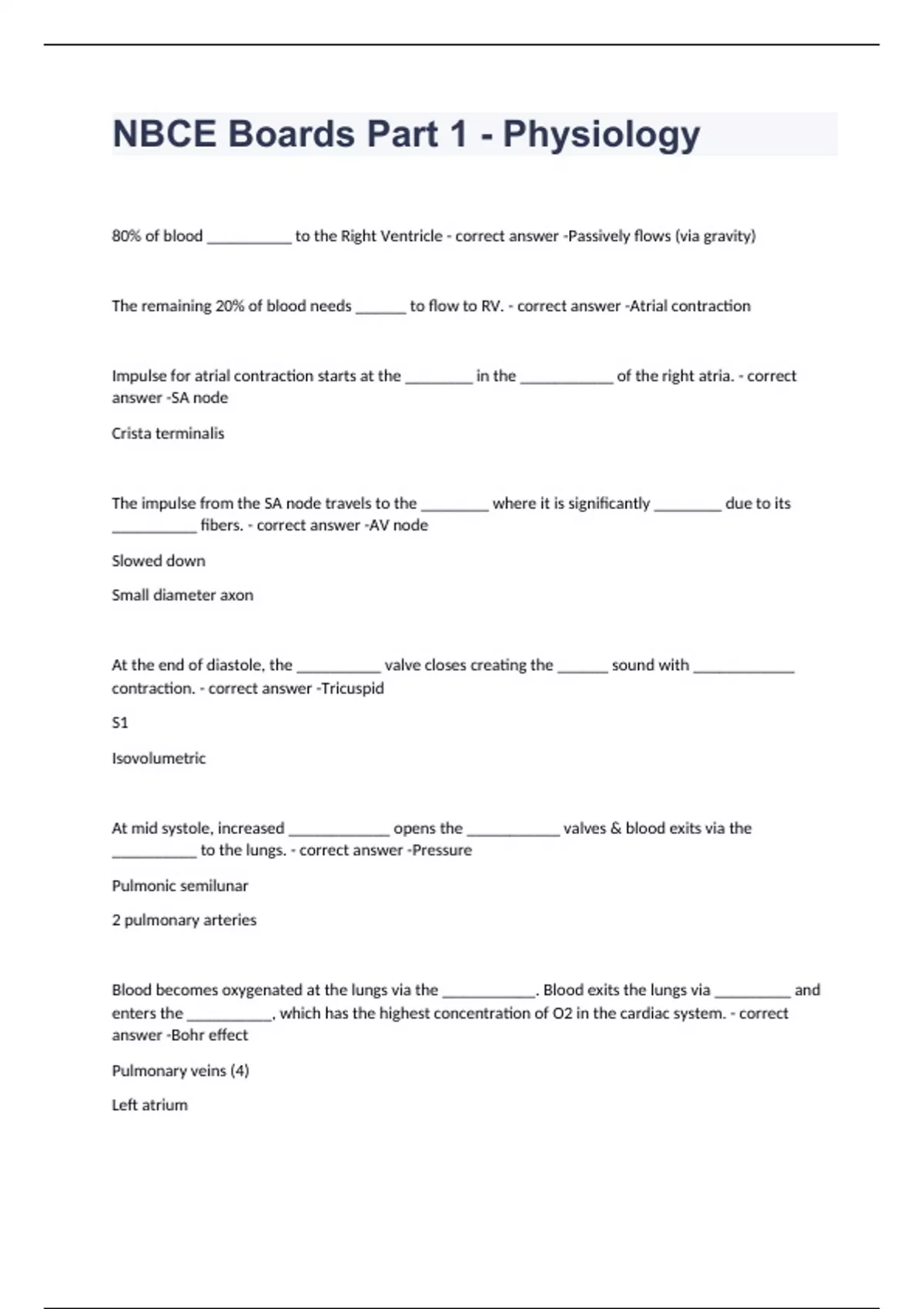 80% of blood __________ to the Right Ventricle - correct answer -Passively flows (via gravity) The remaining 20% of blood needs ______ to flow to RV. - correct answer -Atrial contraction Impulse for atrial contraction starts at the ________ in the ___________ of the right atria. - correct answer -SA node Crista terminalis The impulse from the SA node travels to the ________ where it is significantly ________ due to its __________ fibers. - correct answer -AV node Slowed down Small diameter axon At the end of diastole, the __________ valve closes creating the ______ sound with ____________ contraction. - correct answer -Tricuspid S1 Isovolumetric At mid systole, increased