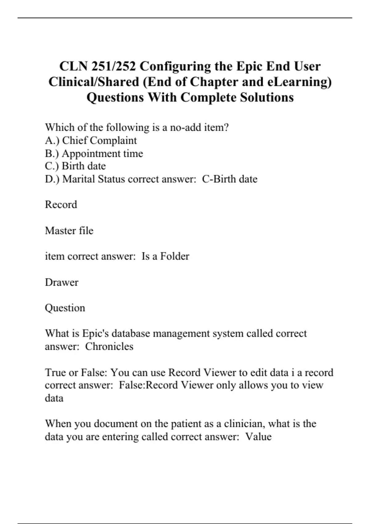 CLN 251/252 Configuring the Epic End User Clinical/Shared (End of Chapter and eLearning) Questions With Complete Solutions