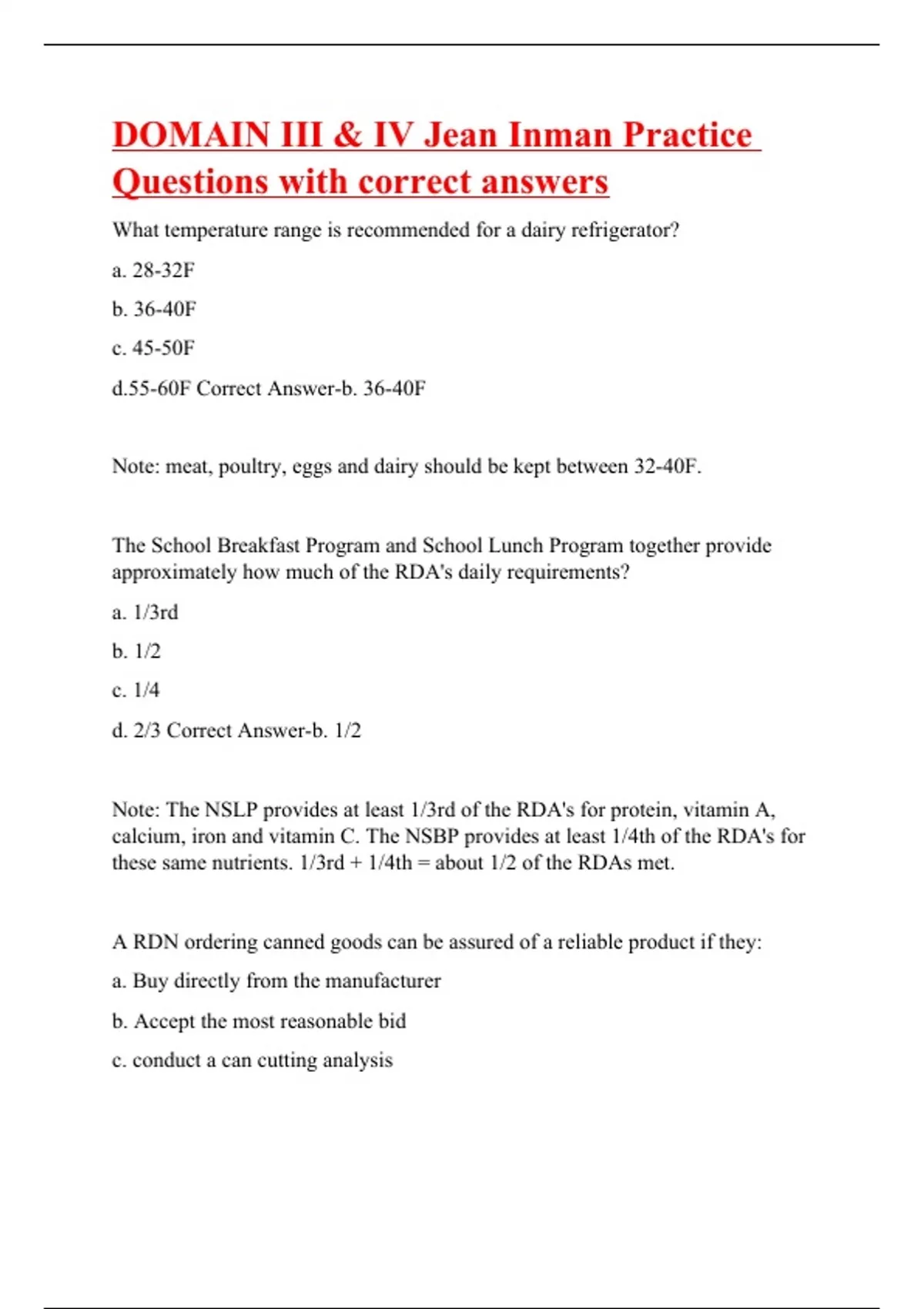 What temperature range is recommended for a dairy refrigerator? a. 28-32F b. 36-40F c. 45-50F d.55-60F Correct Answer-b. 36-40F Note: meat, poultry, eggs and dairy should be kept between 32-40F. The School Breakfast Program and School Lunch Program together provide approximately how much of the RDA's daily requirements? a. 1/3rd b. 1/2 c. 1/4 d. 2/3 Correct Answer-b. 1/2 Note: The NSLP provides at least 1/3rd of the RDA's for protein, vitamin A, calcium, iron and vitamin C. The NSBP provides at least 1/4th of the RDA's for these same nutrients. 1/3rd + 1/4th = about 1/2 of the RDAs met. A RDN ordering canned goods can be assured of a reliable product if they: a. Buy directly from the manufacturer b. Accept the most reasonable bid c. conduct a can cutting analysis d. buy the same brand, grade and size as the last time Corr