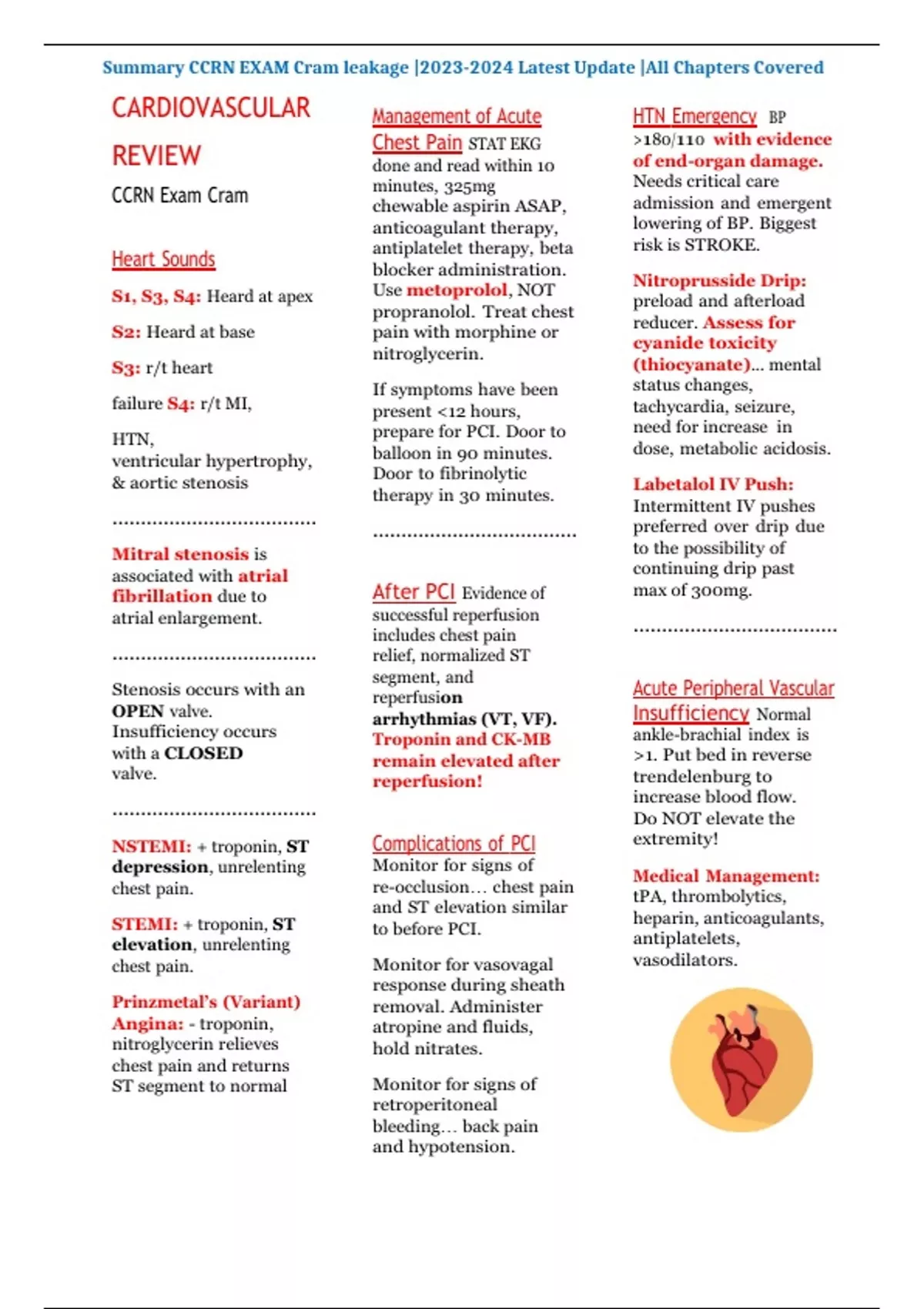 Summary CARDIOVASCULAR REVIEW CCRN Exam Cram leakage | Latest Update |All Chapters Covered