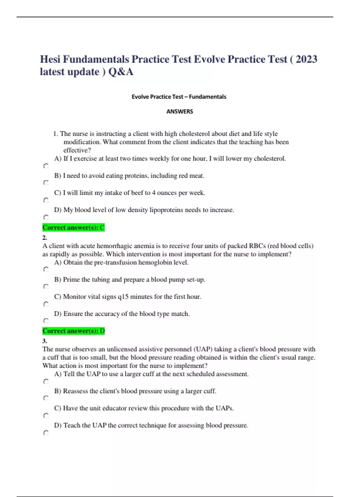 Hesi Fundamentals Practice Test Evolve Practice Test ( 2021 latest update ) Q&A Hesi Fundamentals Practice Test Evolve Practice Test – Fundamentals 1. The nurse is instructing a client with high cholesterol about diet and life style modification. What comment from the client indicates that the teaching has been effective? A) If I exercise at least two times weekly for one hour, I will lower my cholesterol. B) I need to avoid eating proteins, including red meat. C) I will limit my intake of beef to 4 ounces per week. D) My blood level of low density lipoproteins needs to increase. Correct answer(s): C 2. A client with acute hemorrhagic anemia is to receive four units of packed RBCs (red blood cells) as rapidly as possible. Which intervention is most important for the nurse to implement? A) Obtain the pre-transfusion hemoglobin level. B) Prime the tubing and prepare a blood pump set-up. C) Monitor vital signs q15 minutes for the first hour. D) Ensure the accuracy of the blood type match. Correct answer(s): D 3. The nurse observes an unlicensed assistive personnel (UAP) taking a client's blood pressure with a cuff that is too small, but the blood pressure reading obtained is within the client's usual range. What action is most important for the nurse to implement? A) Tell the UAP to use a larger cuff at the next scheduled assessment. B) Reassess the client's blood pressure using a larger cuff. C) Have the unit educator review this procedure with the UAPs. D) Teach the UAP the correct technique for assessing blood pressure. Correct answer(s): B 4. The nurse prepares a 1,000 ml IV of 5% dextrose and water to be infused over 8 hours. The infusion set delivers 10 drops per milliliter. The nurse should regulate the IV to administer approximately how many drops per minute? A) 80 B) 8 C) 21 D) 25 Correct answer(s): C 5. A client is to receive 10 mEq of KCl diluted in 250 ml of normal saline over 4 hours. At what rate should the nurse set the client's intravenous infusion pump? A) 13 ml/hour. B) 63 ml/hour. C) 80 ml/hour. D) 125 ml/hour. Correct answer(s): B 6. When conducting an admission assessment, the nurse should ask the client about the use of complimentary healing practices. Which statement is accurate regarding the use of these practices? A) Complimentary healing practices interfere with the efficacy of the medical model of treatment. B) Conventional medications are likely to interact with folk remedies and cause adverse effects. C) Many complimentary healing practices can be used in conjunction with conventional practices. D) Conventional medical practices will ultimately replace the use of complimentary healing practices. Correct answer(s): C 7. A client is to receive cimetidine (Tagamet) 300 mg q6h IVPB. The preparation arrives from the pharmacy diluted in 50 ml of 0.9% NaCl. The nurse plans to administer the IVPB dose over 20 minutes. For how many ml/hr should the infusion pump be set to deliver the secondary infusion? Correct answer(s): 150 8. The nurse is performing nasotracheal suctioning. After suctioning the client's trachea for fifteen seconds, large amounts of thick yellow secretions return. What action should the nurse implement next? A) Encourage the client to cough to help loosen secretions. B) Advise the client to increase the intake of oral fluids. C) Rotate the suction catheter to obtain any remaining secretions. D) Re-oxygenate the client before attempting to suction again. Correct answer(s): D 9. Which intervention is most important for the nurse to implement for a male client who is experiencing urinary retention? A) Apply a condom catheter. B) Apply a skin protectant. C) Encourage increased fluid intake. D) Assess for bladder distention. Correct answer(s): D 10. A young mother of three children complains of increased anxiety during her annual physical exam. What information should the nurse obtain first? A) Sexual activity patterns. B) Nutritional history. C) Leisure activities. D) Financial stressors. Correct answer(s): B 11. The healthcare provider prescribes the diuretic metolazone (Zaroxolyn) 7.5 mg PO. Zaroxolyn is available in 5 mg tablets. How much should the nurse plan to administer? A) ½ tablet. B) 1 tablet. C) 1½ tablets. D) 2 tablets. Correct answer(s): C 12. During a visit to the outpatient clinic, the nurse assesses a client with severe osteoarthritis using a goniometer. Which finding should the nurse expect to measure? A) Adequate venous blood flow to the lower extremities. B) Estimated amount of body fat by an underarm skinfold. C) Degree of flexion and extension of the client's knee joint. D) Change in the circumference of the joint in centimeters. Correct answer(s): C 13. A hospitalized male client is receiving nasogastric tube feedings via a small-bore tube and a continuous pump infusion. He reports that he had a bad bout of severe coughing a few minutes ago, but feels fine now. What action is best for the nurse to take? A) Record the coughing incident. No further action is required at this time. B) Stop the feeding, explain to the family why it is being stopped, and notify the healthcare provider. C) After clearing the tube with 30 ml of air, check the pH of fluid withdrawn from the tube. D) Inject 30 ml of air into the tube while auscultating the epigastrium for gurgling. Correct answer(s): C 14. An elderly resident of a long-term care facility is no longer able to perform self-care and is becoming progressively weaker. The resident previously requested that no resuscitative efforts be performed, and the family requests hospice care. What action should the nurse implement first? A) Reaffirm the client's desire for no resuscitative efforts. B) Transfer the client to a hospice inpatient facility. C) Prepare the family for the client's impending death. D) Notify the healthcare provider of the family's request. Correct answer(s): D 15. Which nutritional assessment data should the nurse collect to best reflect total muscle mass in an adolescent? A) He
