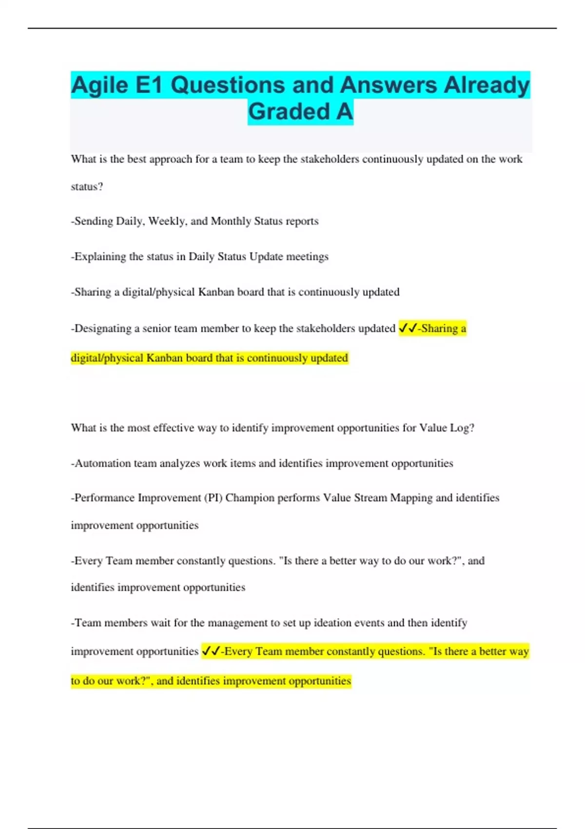 Agile E1 Questions and Answers Already Graded A What is the best approach for a team to keep the stakeholders continuously updated on the work status? -Sending Daily, Weekly, and Monthly Status reports -Explaining the status in Daily Status Update meetings -Sharing a digital/physical Kanban board that is continuously updated -Designating a senior team member to keep the stakeholders updated -Sharing a digital/physical Kanban board that is continuously updated What is the most effective way to identify improvement opportunities for Value Log? -Automation team analyzes work items and identifies improvement opportunities -Performance Improvement (PI) Champion performs Value Stream Mapping and identifies improvement opportunities -Every Team member constantly questions. "Is there a better way to do our work?", and identifies improvement opportunities -Team members wait for the management to set up ideation events and then identify improvement opportunities -Every Team member constantly questions. "Is there a better way to do our work?", and identifies improvement opportunities Which of the following is not a benefit of Visualization of Work? -Reduced inflow of work items -Reduced status reporting overhead -Quick identification of blocked work items -Reduced cycle time of work items -Reduced inflow of work items What should you do when you receive a brief communication that the format of input files will change from next month? -Understand that change by getting the details of the change as well as a sample input file in the new format -Align your People (e.g. training), process (e.g. SOPs), and Technology (e.g. tool configuration) in accordance with the Change -Both Option 1 and Option 2 -Wait for a detailed communication as you received only a brief communication -Both Option 1 and Option 2 Which of the following is not correct way for you to update the content of a knowledge portal? - I create/update the content, get it reviewed and add to the knowledge portal -When I create /update the content, I tag it with the relevant key words -I update the existing content on the topic with the latest knowledge -I have full freedom to create/update content without any review -I have full freedom to create/update content without any review Who should be a Product Owner (PO) in a Value Maximization scrum team? -Only performance improvement (PI) Champion because he/she has a good understanding of Six Sigma and Value Stream Mapping -Anyone who has a clear vision for the selected Value Log opportunities and who can validate whether the implementation achieved the expected benefits -Only Lead because she/he has a good understanding of the team dynamics -Only someone from customer's organization because he/she has good understanding of the market dynamics -Anyone who has a clear vision for the selected Value Log opportunities and who can validate whether the implementation achieved the expected benefits What is the best way to continuously capture and share a team's knowledge? -Continuously updating knowledge into a central repository -Conducting knowledge sharing sessions -Sharing knowledge during team meetings -Sharing knowledge through emails -Continuously updating knowledge into a central repository What should you do when you discover an uncommunicated change in your tool (e.g. Workflow Management tool, ITSM Tool, etc.)? -As a team, understand the change in detail, and update SOP's, scripts, etc. if required -As a team, investigate why the change communication was missed, and take corrective actions to avoid recurrence -As a team, analyze whether any past work items were impacted by this change, and take necessary corrective action of required -All of the above -All of the above Who can add entries to Value Log? -Performance Improvement -SMEs of the team -Team lead -Anyone in the team -Anyone in the team Which of the following is not mandatory practice of Value Maximization Scrum? -Burndown Chart -Sprint -Value Log -Scrum Team -Burndown Chart A BAU team is already struggling to complete their daily BAU work. So they should defer Value Maximization Scrum. True or False? -True(Instead of doing Value Maximization Scrum, they should rather use that time to complete a few more BAU tasks) -False(Value Maximization Scrum must be doing to achieve Audit compliance) -True(BAU team should only do BAU work. They should not focus on anything else, including Value Maximization Scrum) -False (They should start value Maximization Scrum to identify the pain points and improve their way of doing the BAU work -False (They should start value Maximization Scrum to identify the pain points and improve their way of doing the BAU work Which of the following is the least important consideration while forming a Value maximization scrum team? -Associate's years of experience -Value Log entries selected for the sprint -Potential impact on BAU -Associate's skills -Associate's years of experience Which of the following is an Agile approach for work allocation in a team? -Team Lead assigns work to team members without consulting them -One of the Senior assigns work to team members without consulting them -Customer assigns work to team members without consulting them -Team Lead consults team members and assigns work to them -Team Lead consults team members and assigns work to them Which of the following is the most practical and Agile approach for achieving work coordination among a distributed team? -Relocating all team members into one location to promote face-to-face conversation -Having a digital team member to coordinate across locations -Designing a team member to coordinate across locations -Having a Daily Coordination -Having a digital team member to coordinate across locations Which of the following is not characteristic of a good Value Log entry? -An opportunity that can be implemented -An opportunity in which customer sees no value -An opportunity identified by those performing the BAU work -An opportunity with clear detai